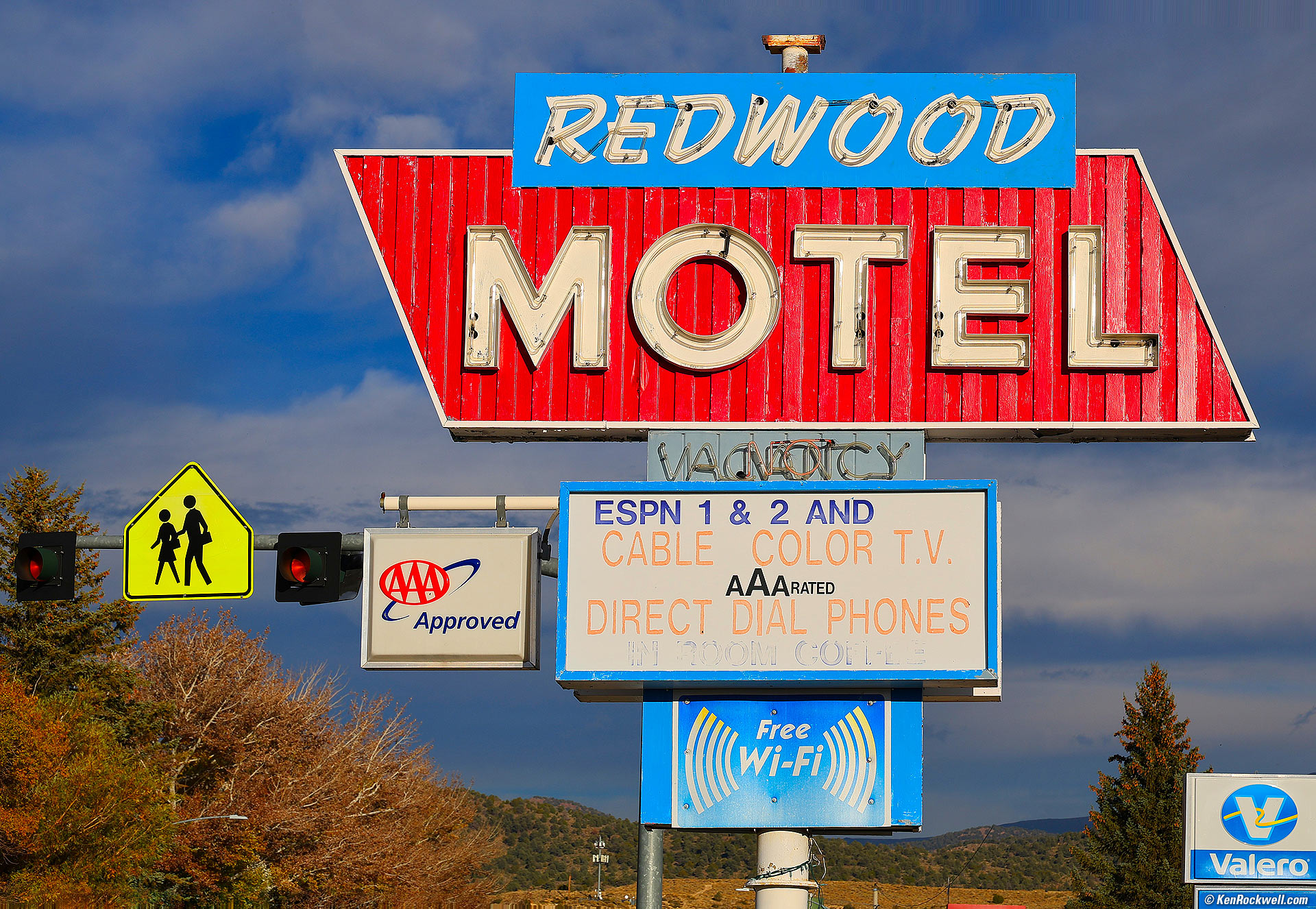 Redwood Motel Sign, Bridgeport, California, 5:04 P.M., 13 October 2023. Canon EOS R6 II, RF 24-240mm IS USM at 94mm, f/11 at 1/400 at Auto ISO 100, -0.3 stops exposure compensation (LV 15.6), Skylum Luminar Neo. More tech details. bigger or fit-to-screen.