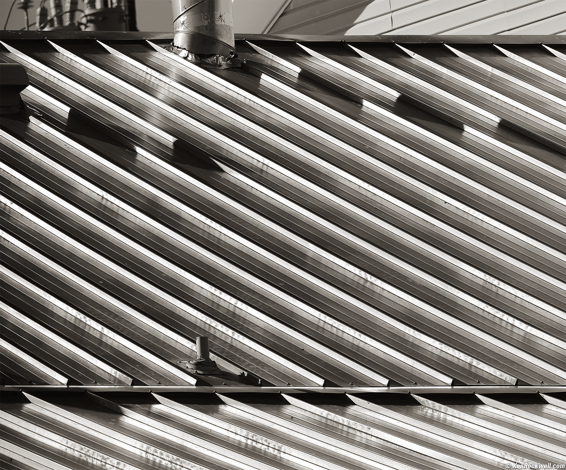 Roof, Redwood Motel, Bridgeport, California, 3:29 P.M., 14 October 2023. Canon EOS R6 II, RF 24-240mm IS USM at 240mm, f/11 at 1/320 at Auto ISO 100 (LV 15.4), split-toned the print. More tech details. bigger or fit-to-screen.