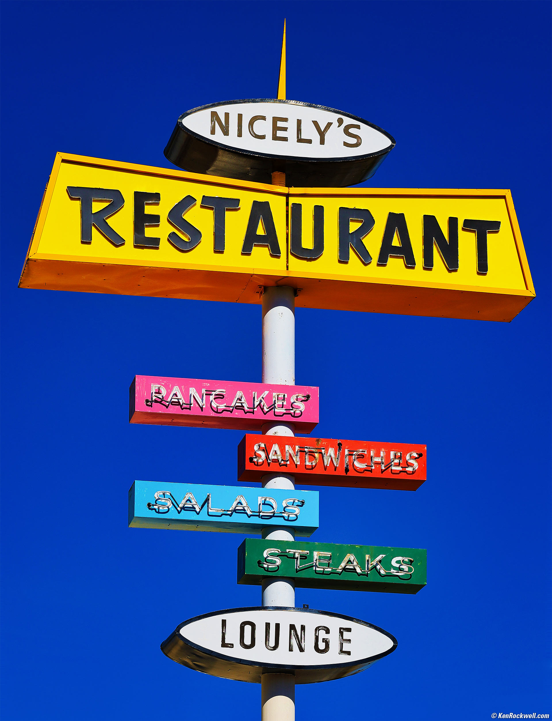 Nicely's Restaurant Sign, Lee Vining, California, 11:09 A.M., 15 October 2023. Canon EOS R6 II, RF 24-240mm IS USM at 105mm, f/10 at 1/400 at Auto ISO 100, -0.7 stops exposure compensation (LV 15¼), Skylum Luminar Neo. More tech details. bigger or fit-to-screen.