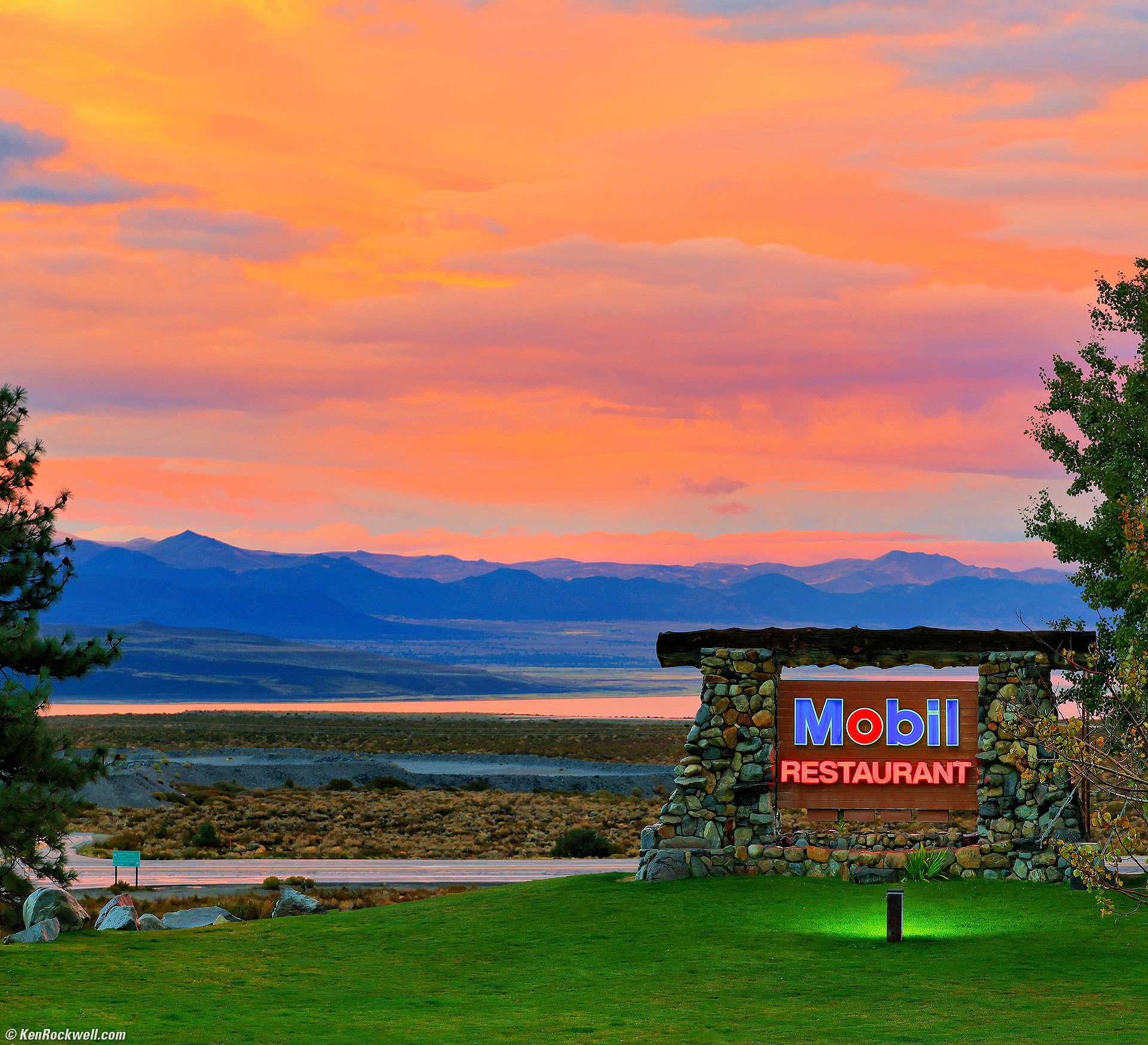 Mono Lake and The Mobil Station at Sunset, Lee Vining, California, 6:22 P.M., 16 October 2024. Canon R5 II, RF 24-240mm IS USM at 79mm at f/5.6 handheld at 1/25 at Auto ISO 200 (LV 8.6), Skylum Luminar Neo and Radiant Photo software. More tech details. bigger or fit-to-screen.
