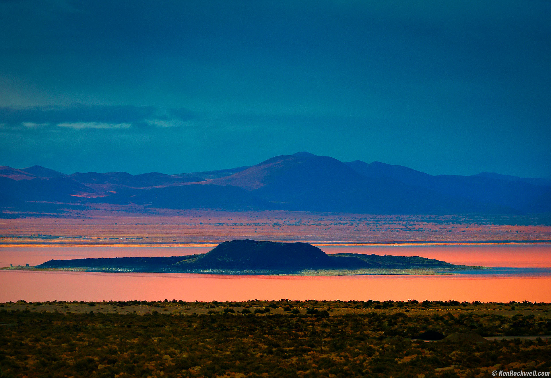 Negit Island at Sunset, Lee Vining, California, 6:23 P.M., 16 October 2024. Canon R5 II, RF 24-240mm IS USM at 157mm at f/6.3 handheld at 1/50 at Auto ISO 640 (LV 8⅓), Skylum Luminar Neo and Radiant Photo software. More tech details. bigger or fit-to-screen.