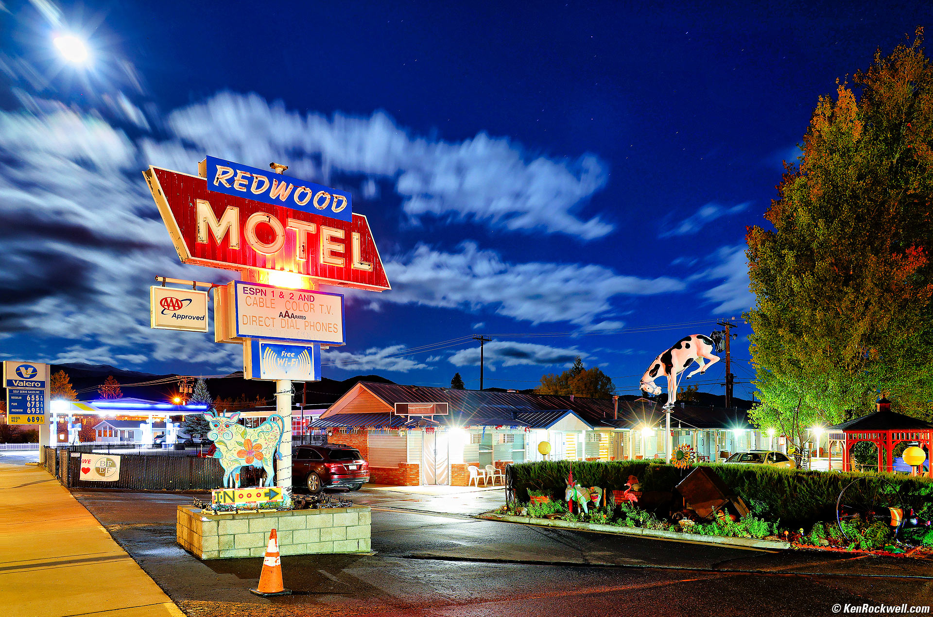 Redwood Motel Under Moonlight, Bridgeport, California, 8:03 P.M., 16 October 2024. Canon R5 II, RF 24-240mm IS USM at 24mm at f/8 for 30 seconds at Auto ISO 200 (LV 0.0), Radiant Photo and Skylum Luminar Neo software, perspective correction in Photoshop CC. More tech details. bigger or fit-to-screen. I used my Oben CT-2491 Carbon-Fibre Tripod with my Oben GH3W-15 Geared Head so I could shoot this at a very low ISO with my R5 II. I should have used one minute at ISO 100, but I was too lazy to trek back to my room to find my remote cord or to twiddle with the Bulb Timer out in the rain, so I let Auto ISO set itself to ISO 200 rather than trying to figure it all out manually as the scene changed by the moment. I chose f/8 so I could get sunstars and a reasonable exposure time.