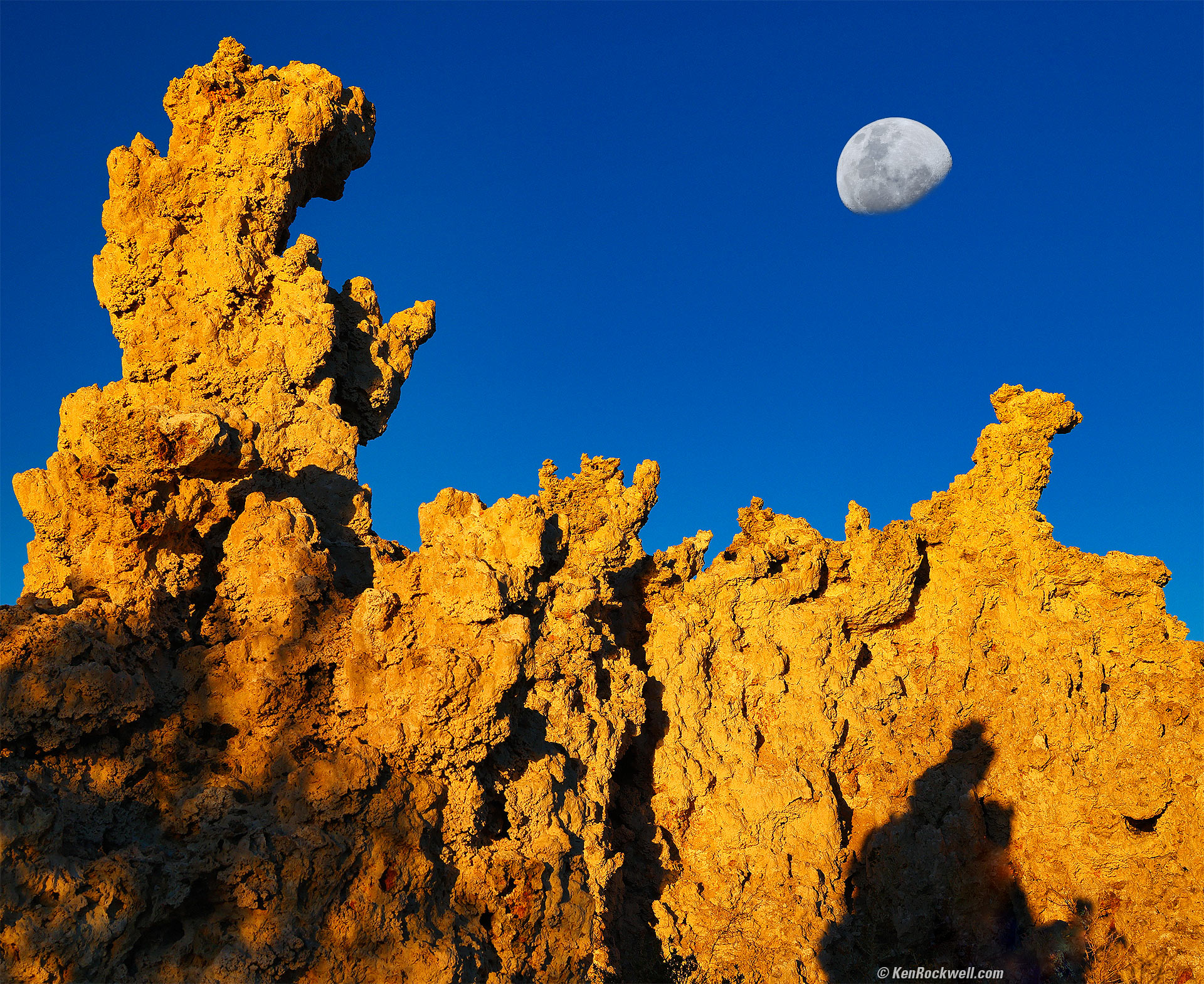 Moonset Behind Tufa at Sunrise, South Tufa, Mono Lake, California, 7:26 A.M., 19 October 2024. Canon EOS R5 II in 4:5 crop mode, RF 24-240mm IS USM at 42mm at f/16 at 1/60 at Auto ISO 100, -0.3 stops exposure compensation (LV 14.0), colors fortified in Skylum Luminar Neo software. bigger or fit-to-screen. I used f/16 for depth-of-field, not realizing until after I returned from my trip and read the 1,200-page manual that my new EOS R5 II easily does focus bracketing and compositing in-camera, even for hand-held shots. I composited a bigger, better moon from Pacific Beach on 15 October 2024 in Photoshop CC, which was a waxing gibbous the same shape as the waning gibbous today. I also rotated the better moon image to match the orientation of the real one. Usually I select and enlarge the actual moon in the image, but recalling how I had a much better one the same shape from the week before, went with it to make this a much more accurate rendition, meaning this work captures the feeling of the moment much better than the straight image - knowing that no one will ever know I embellished the moon 😁.