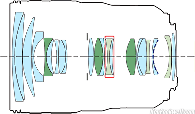 Optics specifications topCanon RF 24-70mm f/2.8L Internal Optical Construction. Aspherical and UD elements. Red Box: Image Stabilizer group. Dashed lines: Air-Sphere Coating. 21 elements in 15 groups. 3 UD extra-low dispersion elements, which help reduce secondary axial chromatic aberration. 3 aspherical elements Front and rear fluorine coatings to resist dirt and smudges. Air-sphere continuously-variable index of refraction coated for ghost reduction. "Pumper" zoom; front section moves in and out as zoomed.
