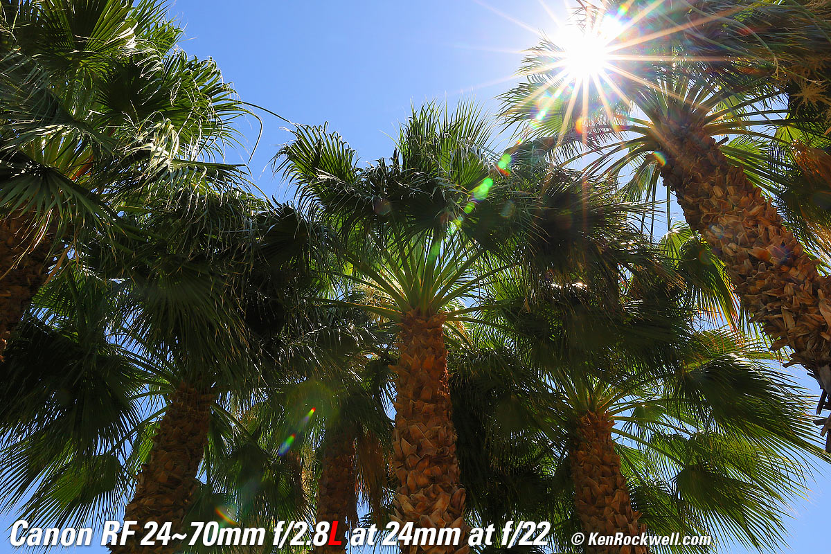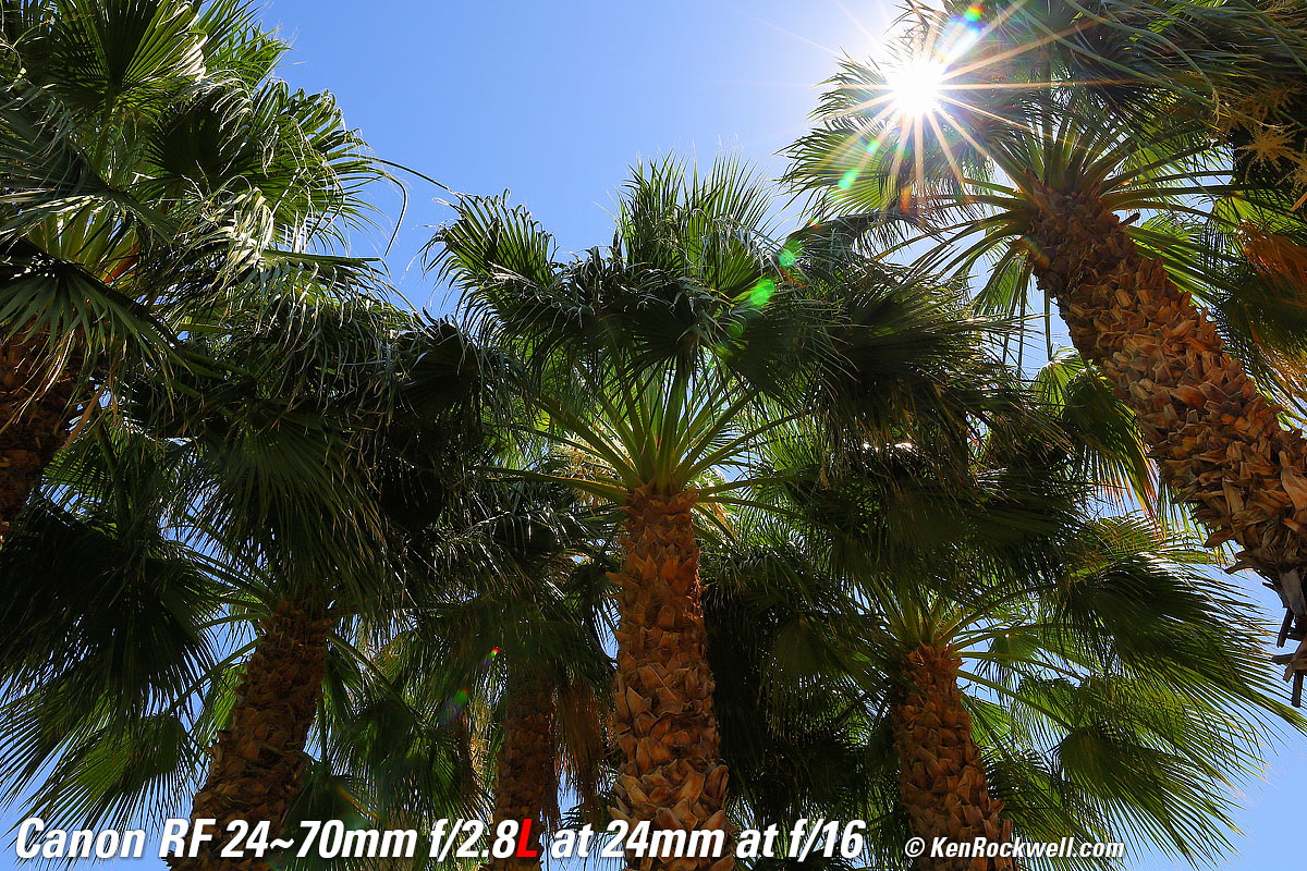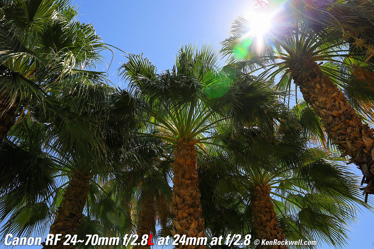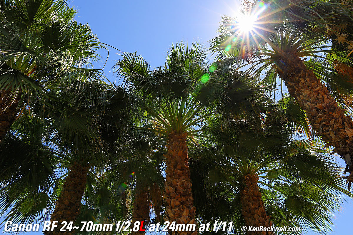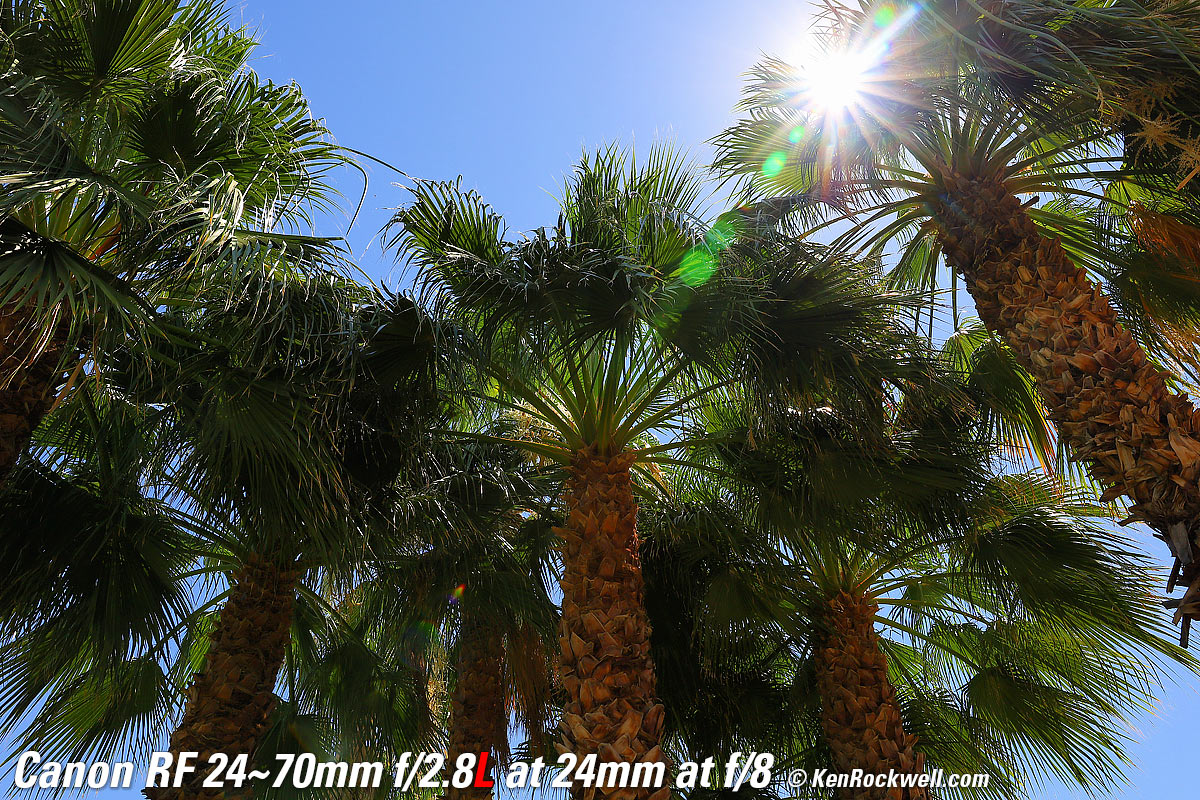 November 2025 Canon Reviews Mirrorless RF Lenses EF Lenses Flash All Reviews Sample Images topSample Images Intro Compatibility Compared User's Guide Recommendations These are just snapshots and there are many more throughout the review; my real work is in my Gallery. These are all shot hand-held as NORMAL JPGs; no tripods, FINE JPGs or RAW CR3 files were used or needed. Shot where 24-70/2.8 lenses look their worst (wide-open at 24mm), this snap says it all because it's flawless: Seven Palms Oasis at Last Light, 7:29 PM, 25 June 2020. Canon EOS RP, Canon RF 24-70mm f/2.8 L IS at 24mm wide-open at f/2.8 at 1/400 at Auto ISO 100 (LV 11.6), exactly as shot. bigger or camera-original © JPG file. This RF 24-70mm f/2.8L IS USM screams quality when you see that even the corners are super-sharp wide-open: 1,200 × 900 pixel crop (5.2× magnification) from top right at f/2.8. bigger or camera-original © JPG file.