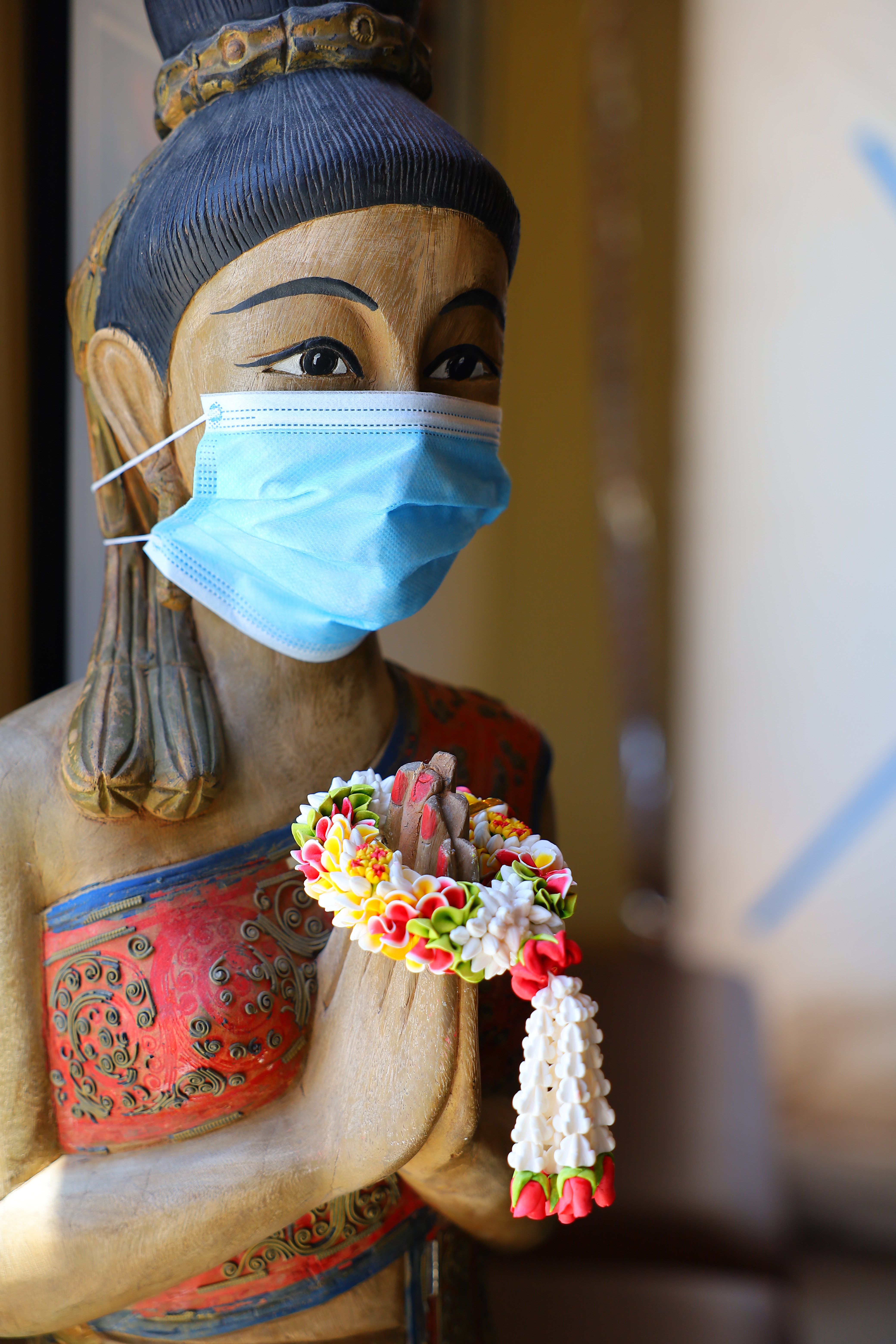 Mask On, My Thai, La Quinta, 11:55 AM, 01 July 2020. Canon EOS RP, Canon RF 24-70mm f/2.8 L IS at 70mm at f/3.2 at 1/100 at Auto ISO 125 (LV 9.7), Perfectly Clear. bigger or camera-original © JPG file. As always, if you want to throw the background as far out of focus as possible, shoot at 70mm at f/2.8 and get as close as you can.