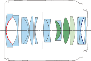 Optics specifications topInternal Optical Construction. Regular Optical Glass, Aspherical and UD glass elements. Red dashes show Air-Sphere Coating and dark-blue dashes show Sub-Wavelength Coating. 15 elements in 11 groups. 1 aspherical element. 2 UD extra-low dispersion elements, which help reduce secondary axial chromatic aberration. Internal focusing. Canon says it's rear focusing, however the focus groups are all inside the lens and neither the front nor rear elements move — good! Super Spectra multicoating, also Air Sphere variable-refractive-index coating (ASC) and Sub-Wavelength Coatings (SWC). Fluorine coating to resist dirt and smudges.