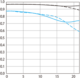 Avoid f/11 and smaller unless you really need it for extreme depth of field because diffraction takes its toll. See also How to Calculate the Sharpest Aperture. MTF wide-open at f/1.4 at 10 cyc/mm (black) and 30 cyc/mm (blue). Sagittal (solid) and meridional (dashed). While it's usually valid to compare rated MTFs between different lenses of a similar age from the same maker, every maker measures or simply calculates MTF very differently, and therefore one cannot compare these curves between brands.