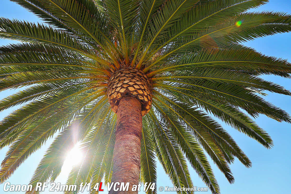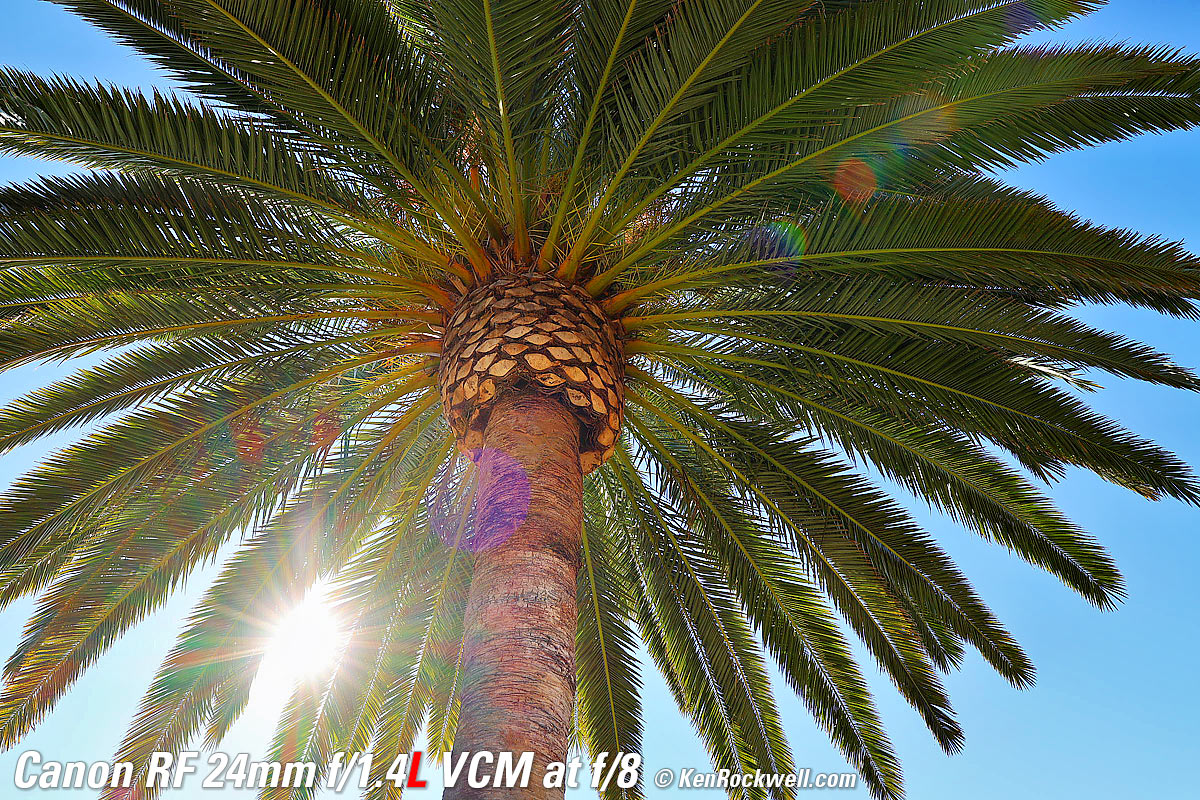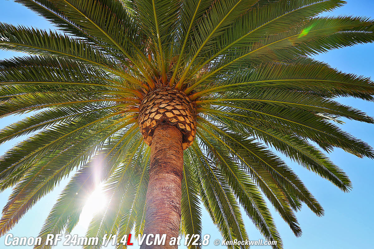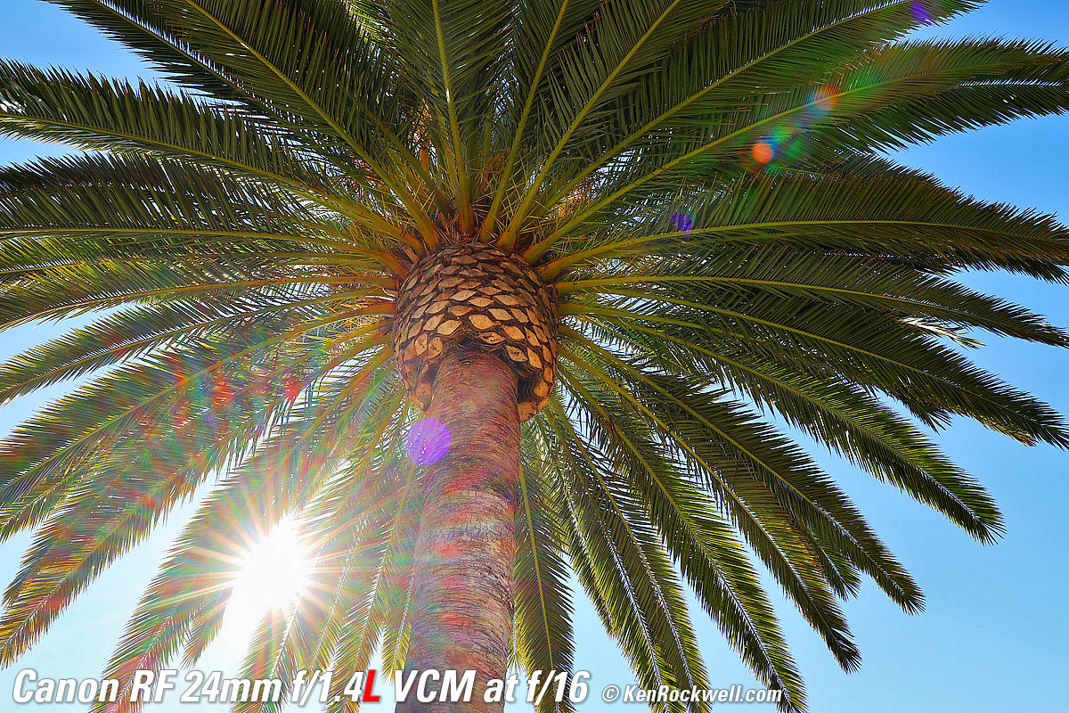 Sunstars performance topWith an 11-bladed rounded diaphragm, I get mild 22-point sunstars on brilliant points of light only at the smallest apertures. Ignore the vertical smear at large apertures. This is a sensor artifact called interline transfer smear and is a camera, not a lens, defect. Likewise ignore the crazy rainbow dots at small apertures; these are sensor artifacts caused by interference among the divisions between pixels on the sensor. These are made visible because we're using enough exposure to show the dark underside of a huge palm tree, and then putting the blinding disk of the mid-day sun in it. Doing this will show everything due to the insane lighting range. Click any to enlarge: Click any to enlarge.