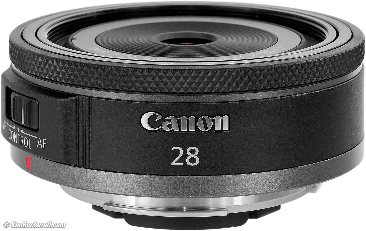 R1 R3 R5 II R5 R5C R6 III R6 II R6 R R8 RP R7 R10 R50 R50V R100 Bodies Compared RF Lenses EF Lenses Flash Canon RF 28mm f/2.8 STM (55mm filters, 4.1 oz./117 g, 0.75'/0.23m close focus, 0.17 × macro ratio, $299). bigger. I got mine at B&H. I'd also get it at Adorama, at Amazon or at Crutchfield, or used at eBay if you know How to Win at eBay. This 100% all-content, junk-free website's biggest source of support is when you use those or any of these links to my personally approved sources I've used myself for way over 100 combined years when you get anything, regardless of the country in which you live — but I receive nothing for my efforts if you take the chance of getting it elsewhere. Canon does not seal its boxes in any way, so never buy at retail or any other source not on my personally approved list since you'll have no way of knowing if you're missing accessories, getting a defective, damaged, returned, dropped, incomplete, gray-market, store demo or used lens — and my personally approved sources allow for 100% cash-back returns for at least 30 days if you don't love your new 28mm. I've used many of these sources since the 1970s because I can try it in my own hands and return it if I don't love it, and because they ship from secure remote warehouses where no one gets to touch your new lens before you do. Buy only from the approved sources I've used myself for decades for the best prices, service, return policies and selection.