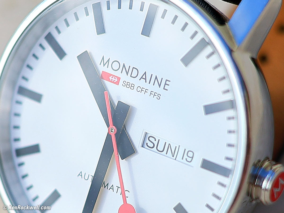 Mondaine A132.30348.11SBB at close-focus distance at f/2.8, 19 November 2023. Shot on R6 II wide-open at f/2.8. bigger or cropped.