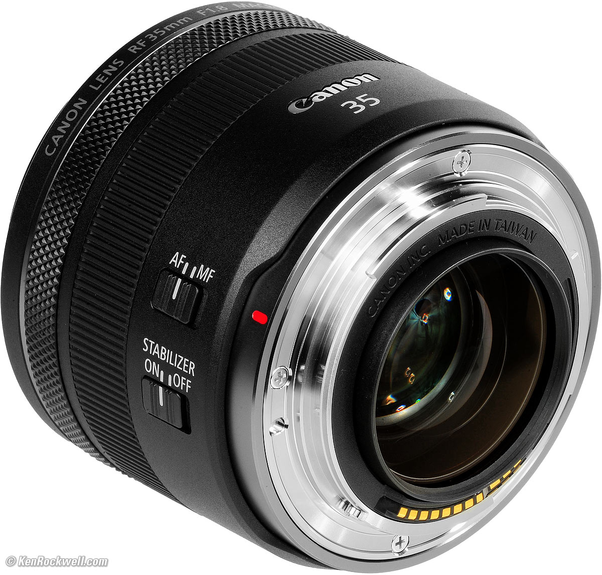 NameCanon calls this the Canon Lens RF35mm f/1.8 MACRO IS STM. RF: Works only on Canon's EOS-R Mirrorless cameras. MACRO: Focuses down to just a few inches. IS: Image Stabilization. STM: Stepper autofocus Motor.