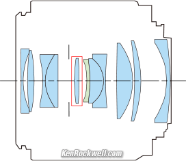 OpticsCanon RF 35mm f/1.8 IS MACRO STM internal optical construction. Aspherical element. IS group. 11 elements in 9 groups. One Aspherical element. The sensor is on the right; this lens has more glass in the back than in the front where you can see it.