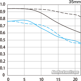 1,200 × 900 pixel crop from above. bigger or camera-original © file. If this 1,200 × 900 pixel crop is about 6" (15cm) wide on your screen, then the complete image printed at this same extreme magnification would be about 21 × 31" (1.7 × 2.6 feet or 50 × 80 cm). If this 1,200 × 900 pixel crop is about 12" (30cm) wide on your screen, then the complete image printed at this same extreme magnification would be about 42 × 62" (3.5 × 5.2 feet or 1.05 × 1.6 meters). f/22 does get softer due to diffraction. Canon RF 35mm f/1.8 IS STM Macro MTF wide-open at 10 cyc/mm (black) and 30 cyc/mm (blue). Sagittal (solid) and meridional (dashed).