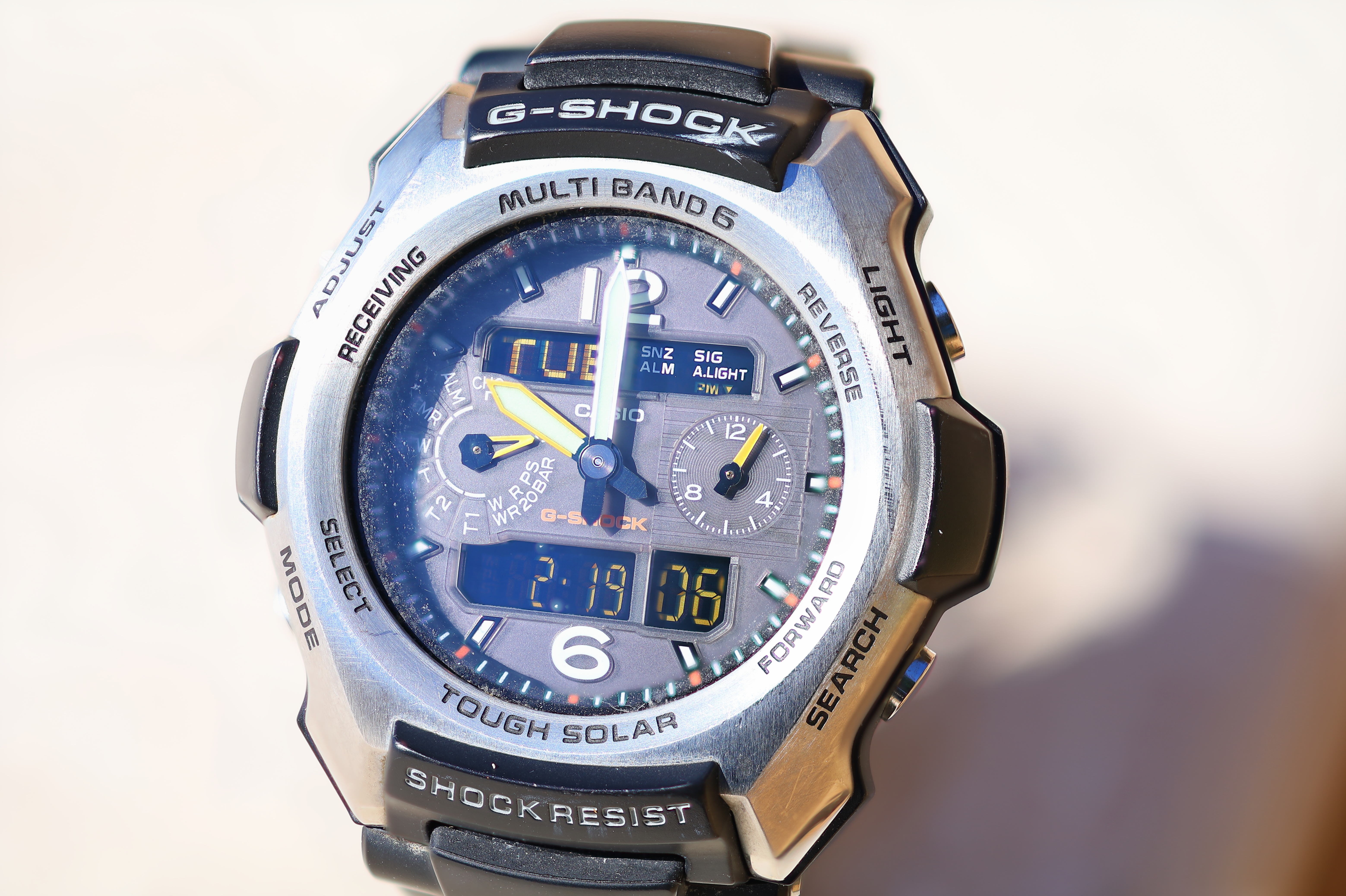 At f/1.8It's super sharp at f/1.8, bravo! Of course the depth-of-field is vapor-thin, so almost nothing is in focus: Casio G-Shock Solar Atomic Watch at close-focus distance, 18 February 2019. bigger or camera-original © file.