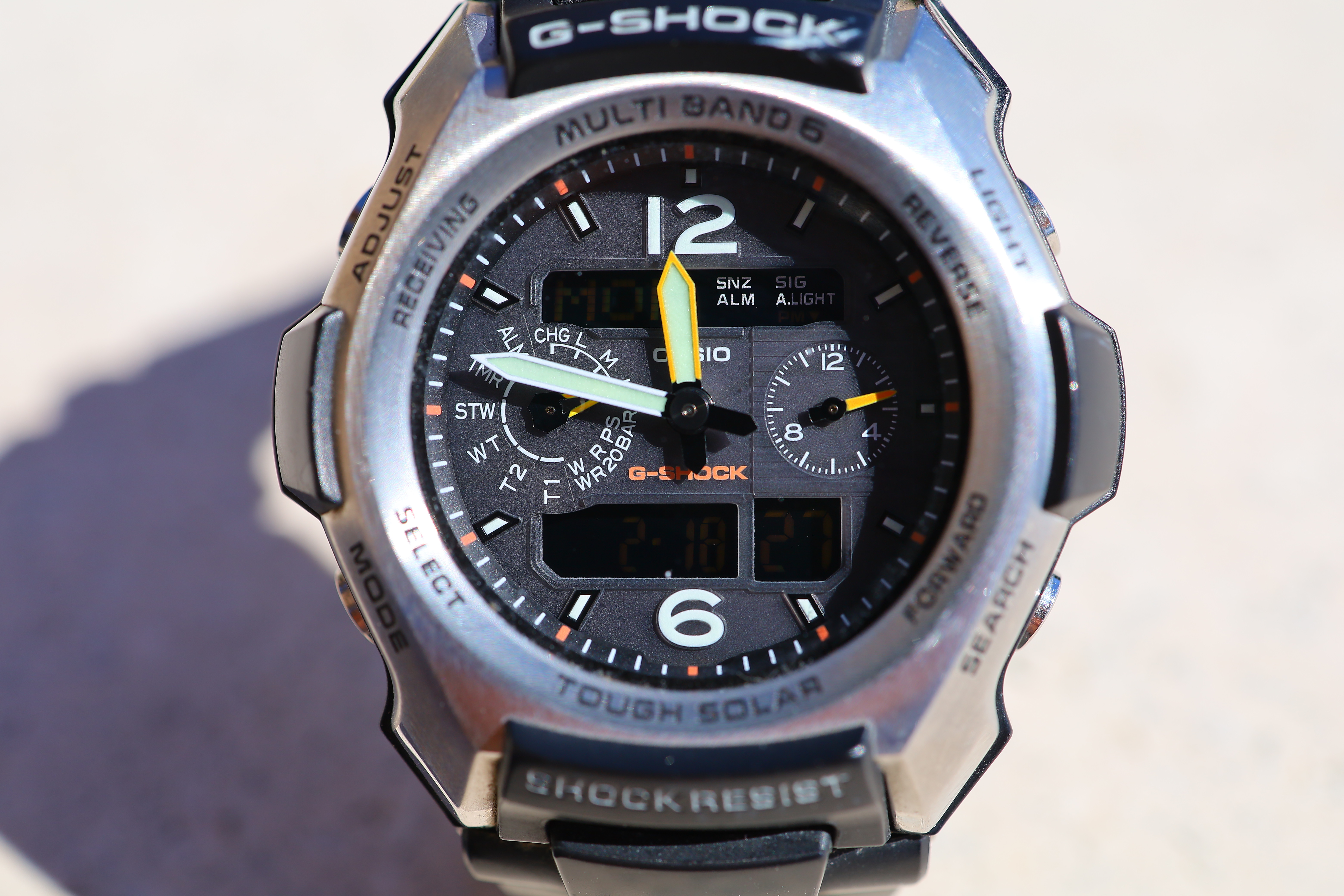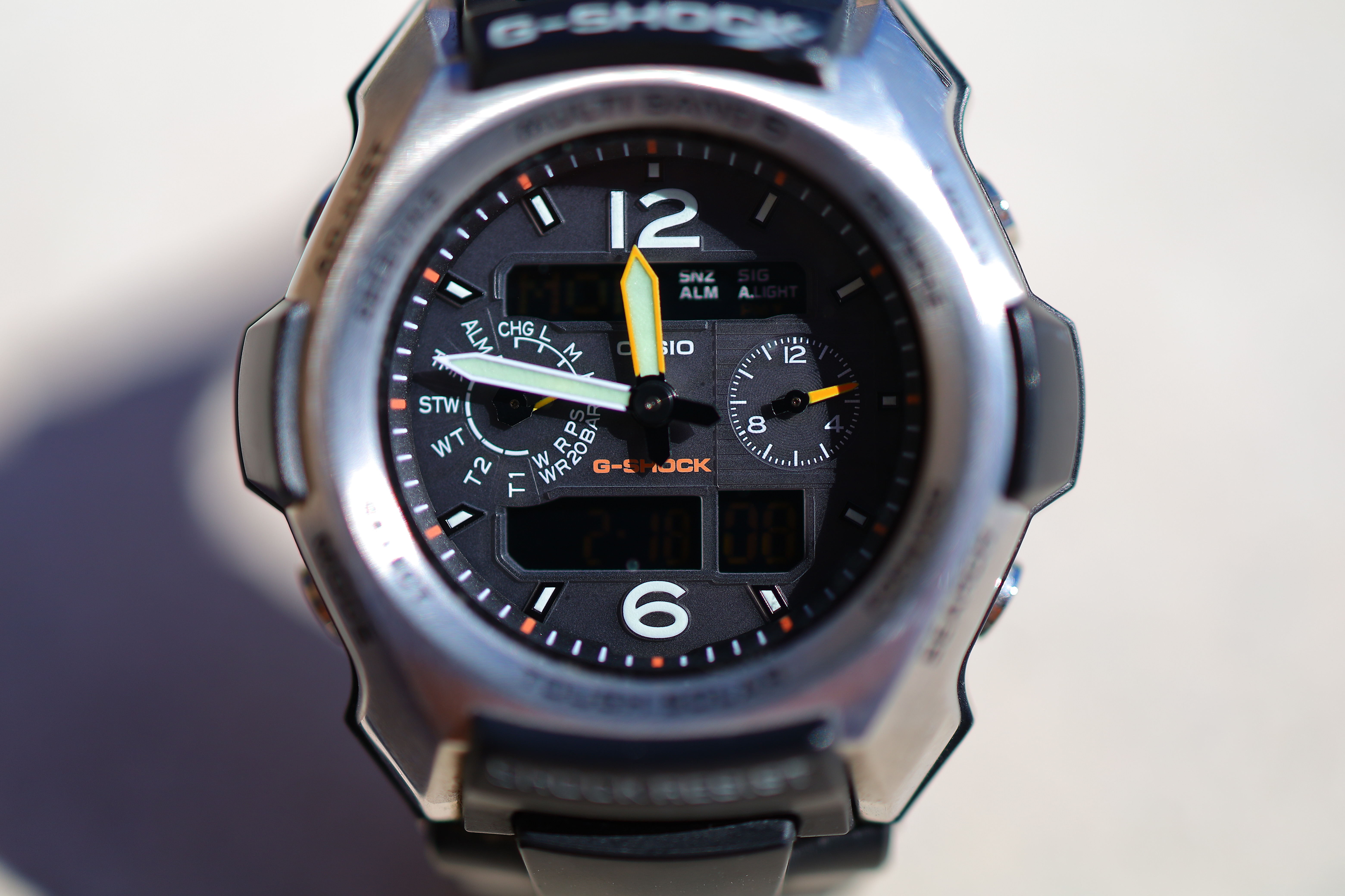 At f/5.6It's also super sharp at f/5.6. There is a little more depth-of-field than at f/1.8, but not much. This is simply the laws of physics: Casio G-Shock Solar Atomic Watch at close-focus distance, 18 February 2019. bigger or camera-original © file.