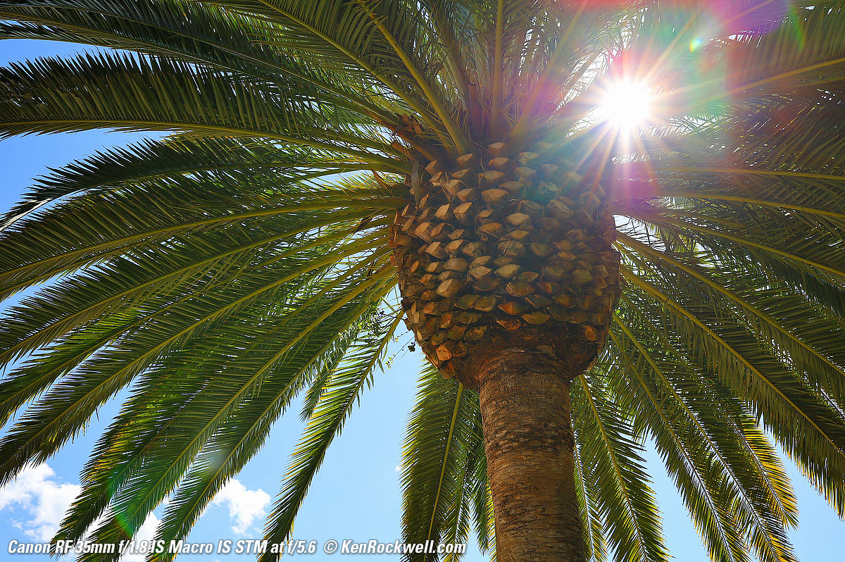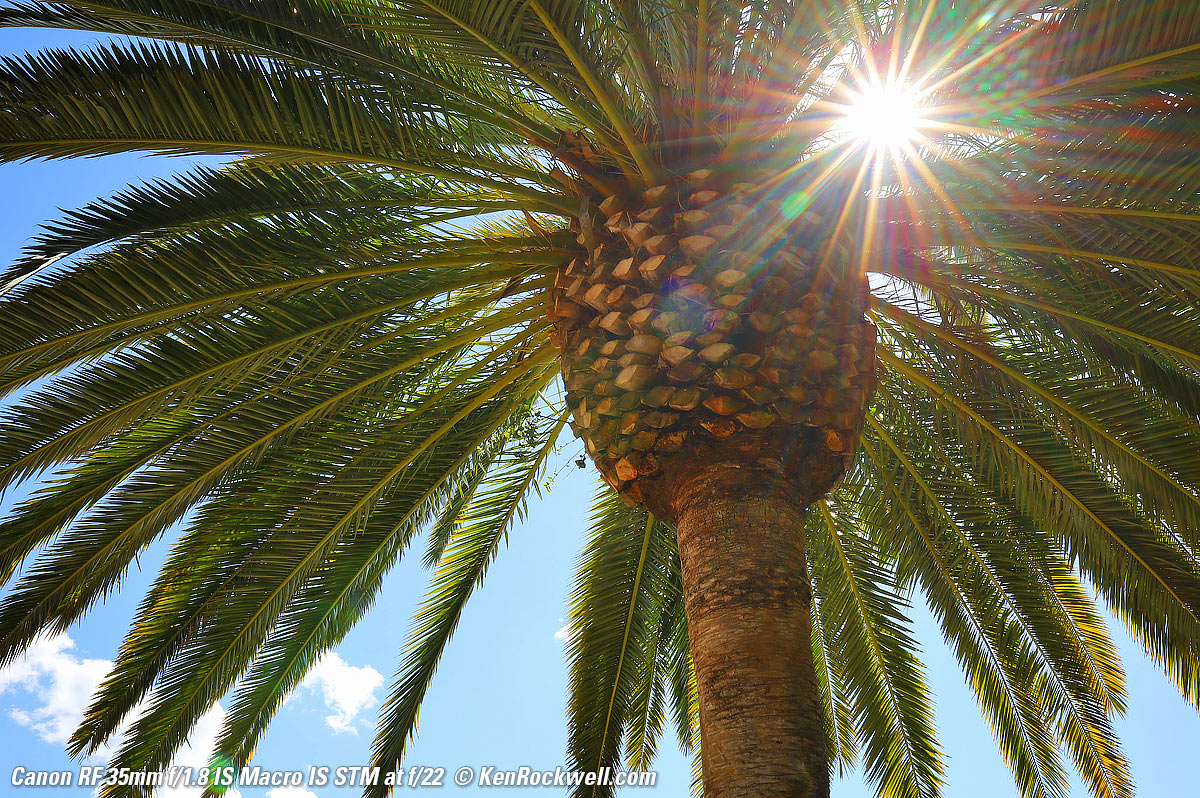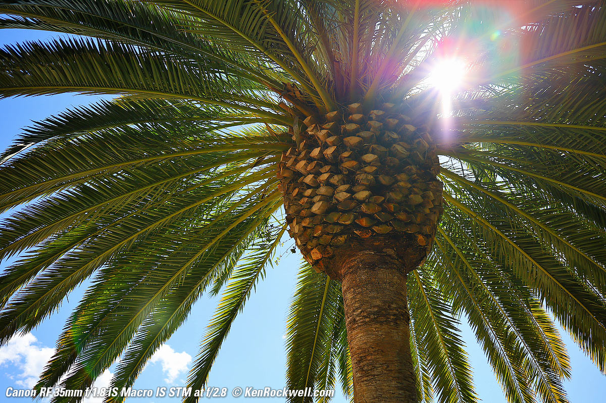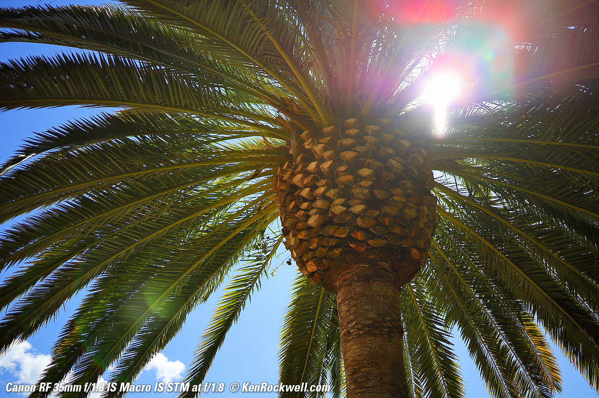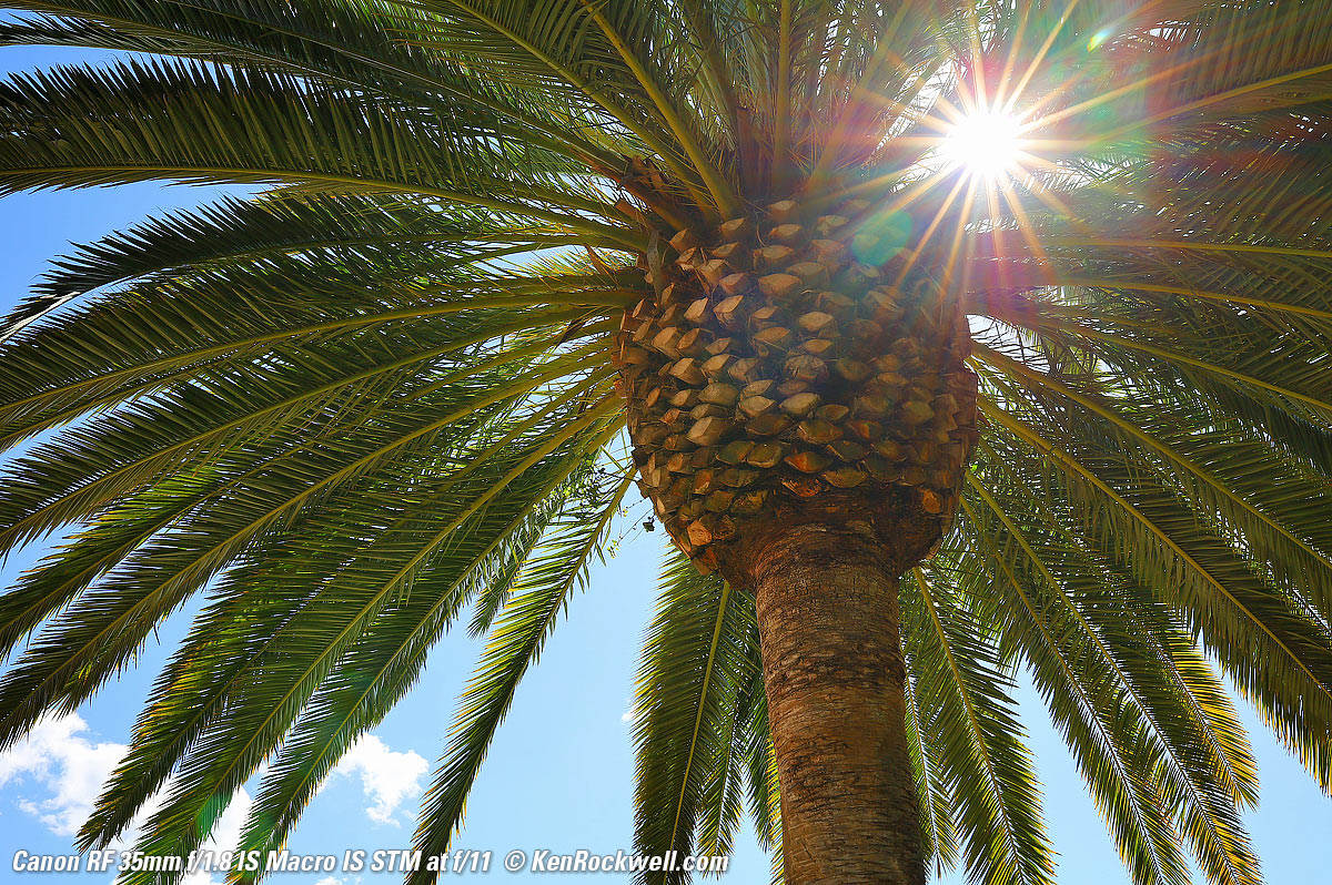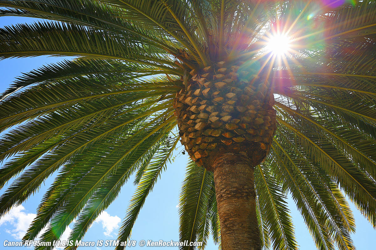 Just as sharp at f/1.8!What's special is that it's just as sharp wide-open at f/1.8 (remember that the depth of field is very thin and very little is in focus): Canary Palm Tree, 9:12 AM, Tuesday, 19 February 2019. Canon EOS RP, Canon RF 35mm f/1.8 Macro IS STM, f/1.8 at 1/1,000 at ISO 100 (LV 11.6), Perfectly Clear. bigger or full-resolution or camera-original © JPG file.