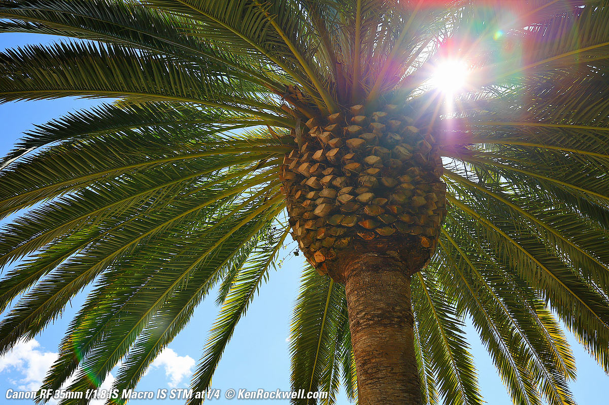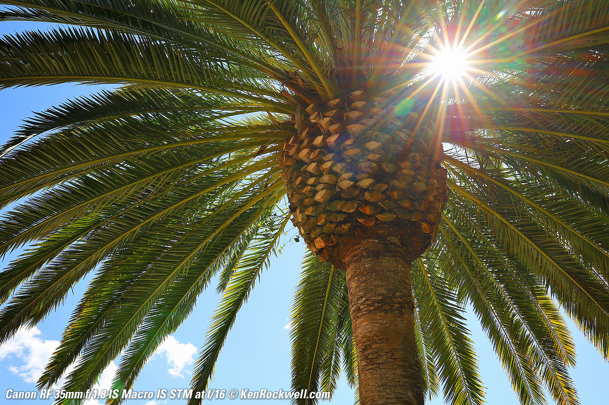 SunstarsThe rounded 9-bladed diaphragm gives 18-pointed sunstars on brilliant points of light at moderate and smaller apertures. The weird square or polka-dot flare around the sun are sensor artifacts caused by me shining the full disk of the sun directly on the sensor in these photos that are exposed for the dark underside of the palm tree. You'll never see these in normal phots, and they come from the camera, not the lens. Click any image to enlarge: Click any image to enlarge.
