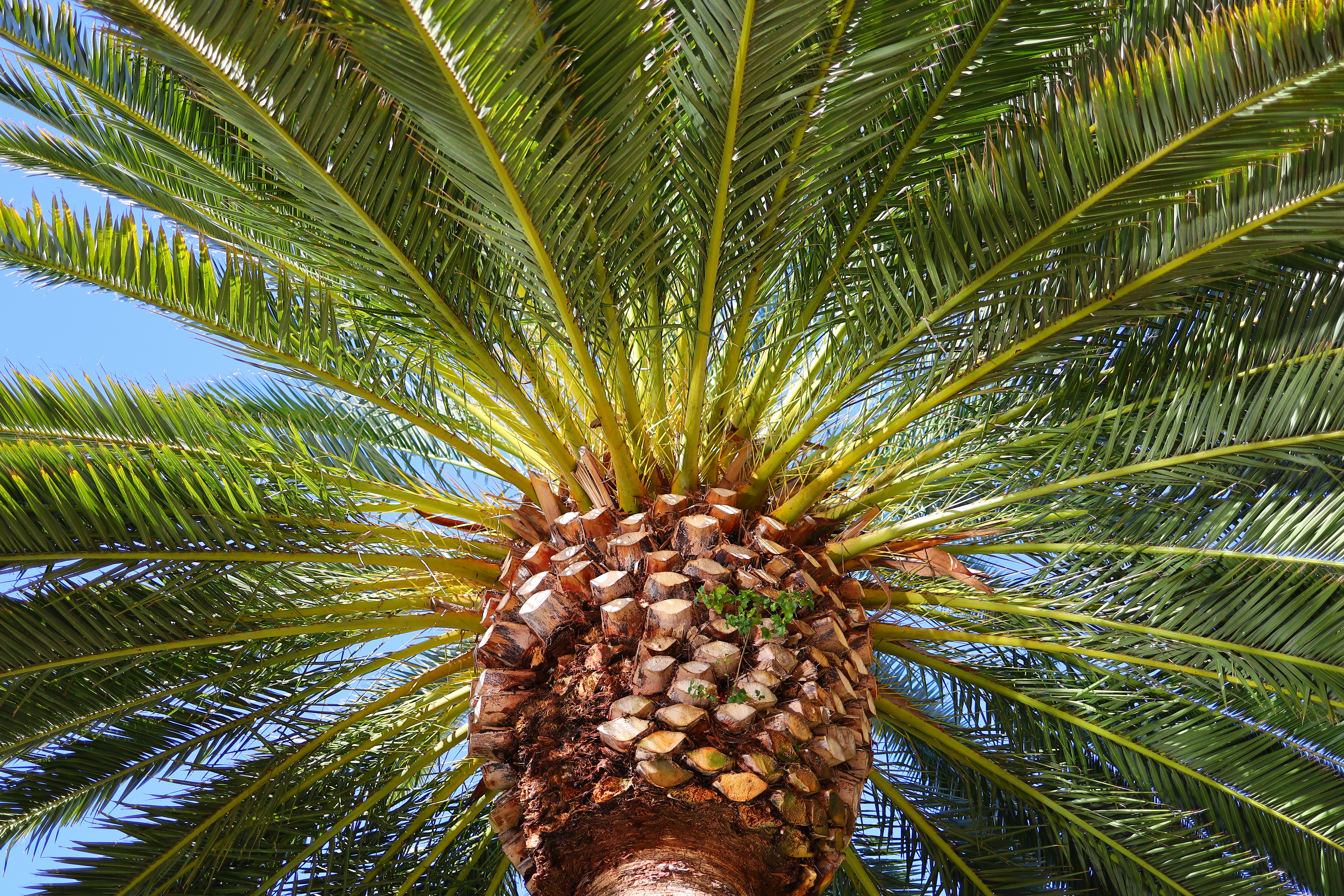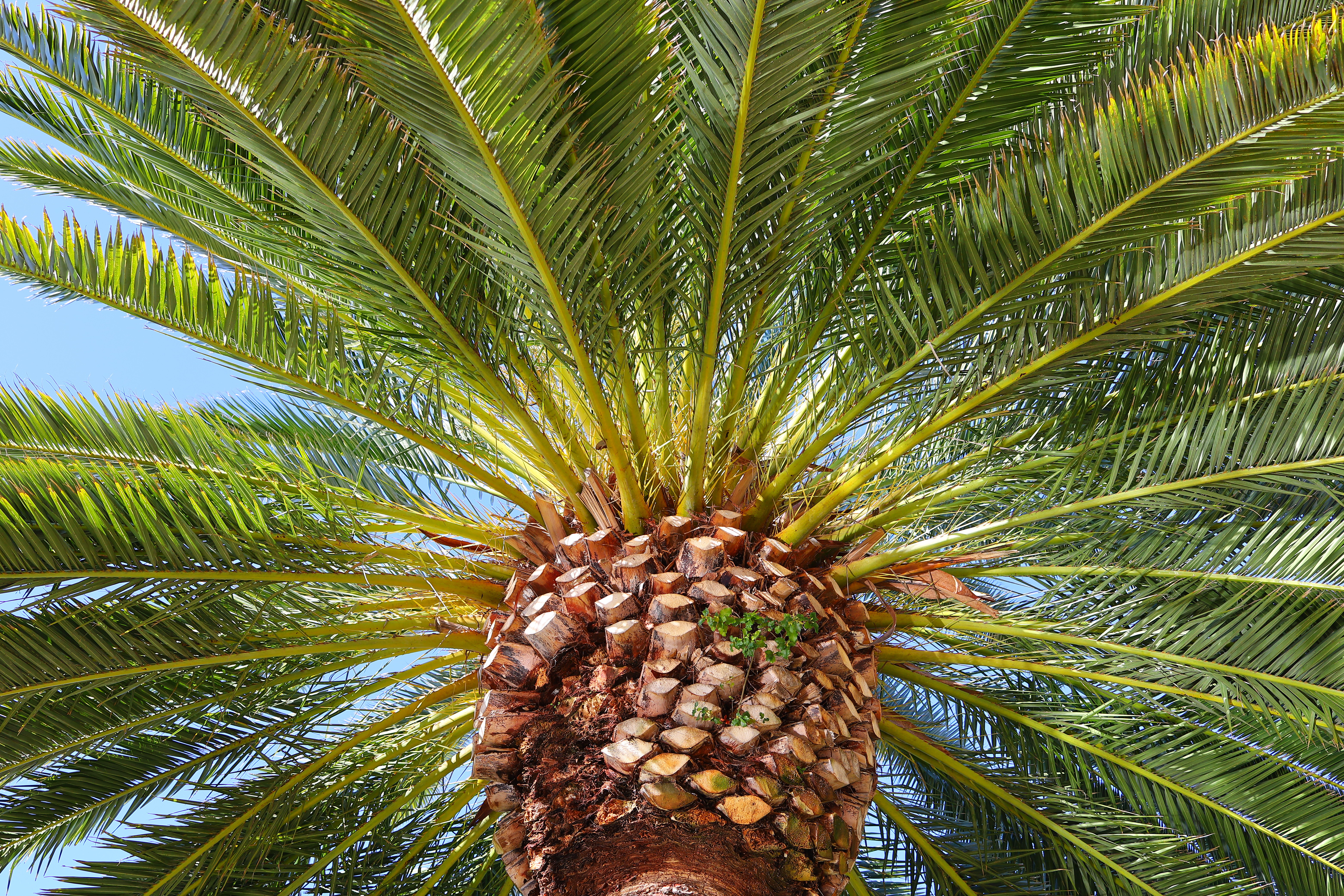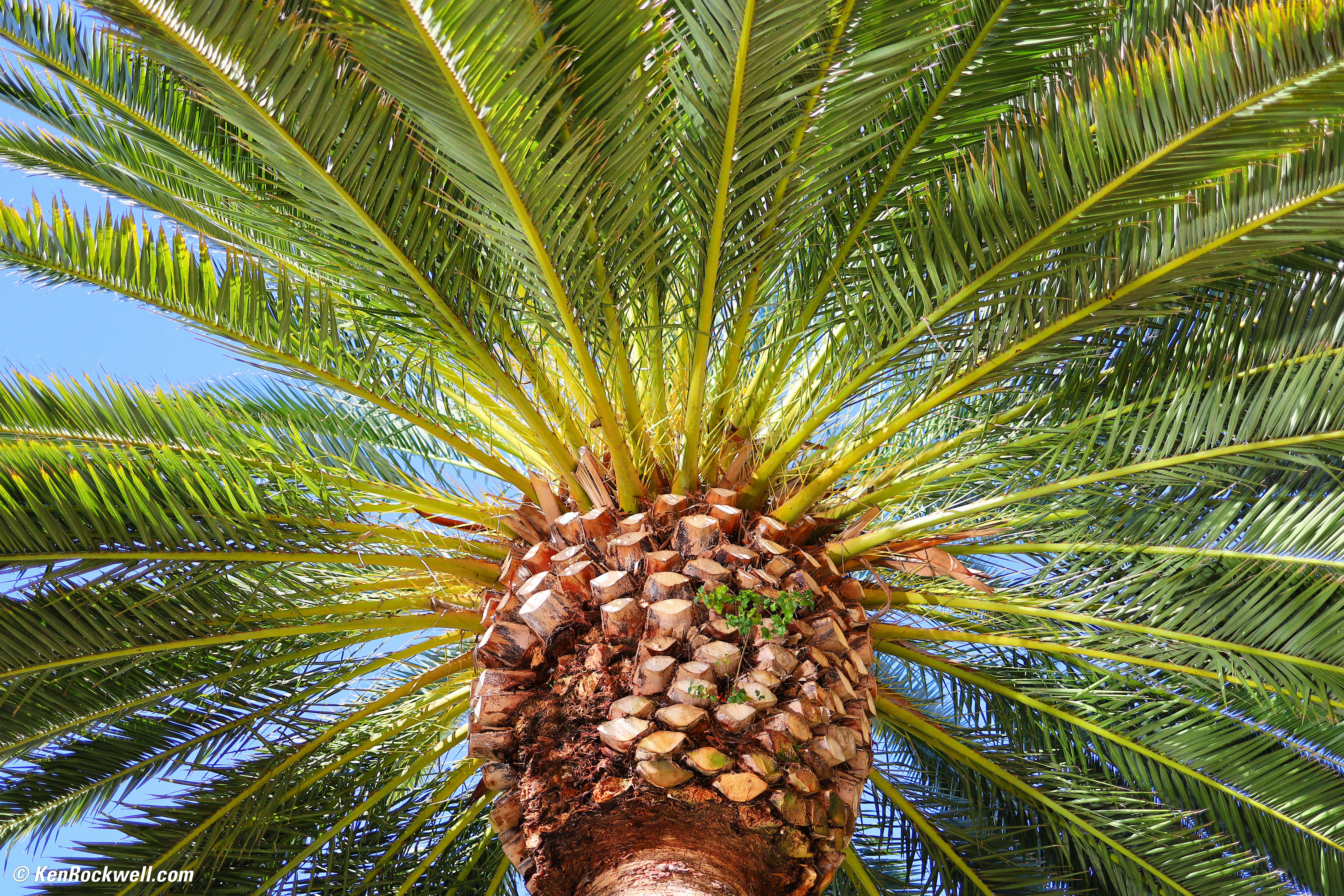 Ultra sharp at f/4:Canary Palm Tree, 9:12 AM, Tuesday, 19 February 2019. Canon EOS RP, Canon RF 35mm f/1.8 Macro IS STM, f/4 at 1/200 at ISO 100 (LV 11.6), Perfectly Clear. bigger or full-resolution or camera-original © JPG file.