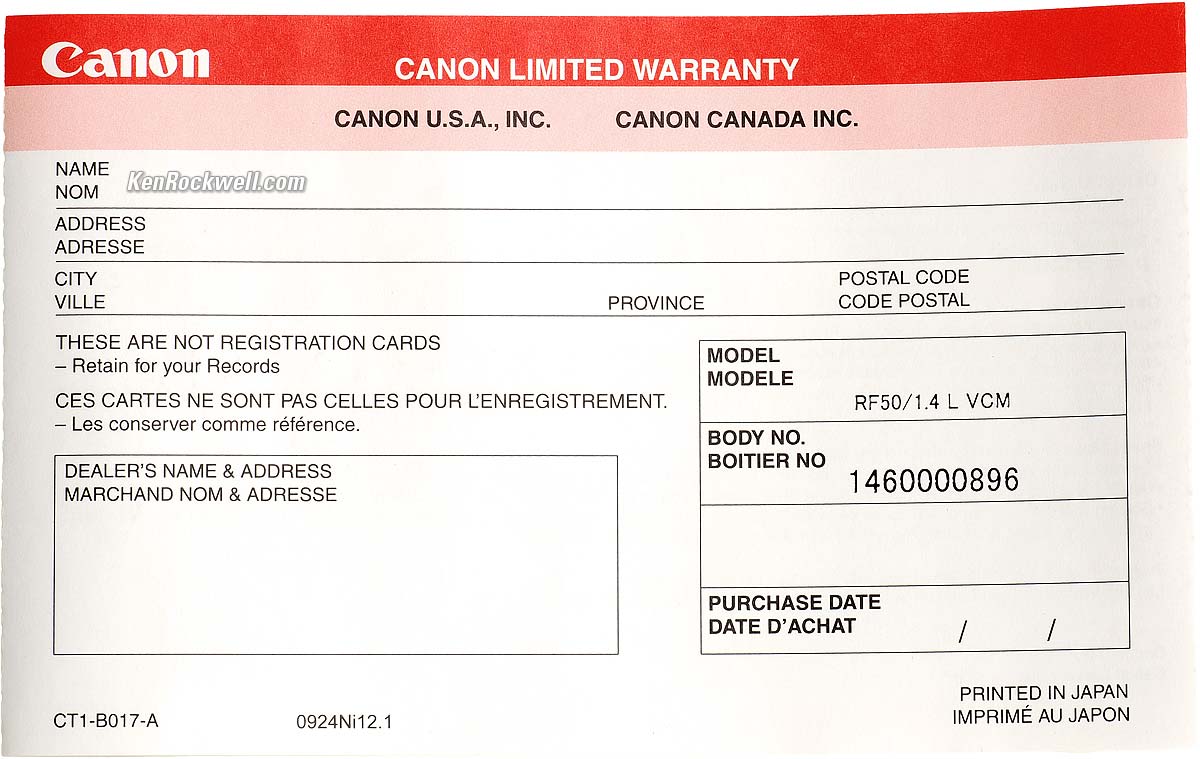 Getting a Legal U. S. A. Version topSample Images Intro New Good Bad Missing Specifications Accessories USA Version Performance Usage Recommendations More I got my RF 50mm f/1.4L VCM at B&H. I'd also get mine at Adorama, at Amazon or at Crutchfield, or get it used if you know How to Win at eBay. This section applies in the U. S. A. only. U. S. A. warranty card. bigger. Your box must include a printed U. S. A. warranty card from Canon U.S.A., Inc. It should be on top inside your box as you open it. The serial number on the card must match the serial number on the bottom of your lens. If you have no card or the serial number doesn't match, you got ripped off with a gray market version intended to be sold in another country. This is why I never buy from any place other than my personally approved sources. You just can't take the chance of buying elsewhere, especially at any retail store where strangers have probably opened your completely unsealed box and played with your lens, because non-U. S. A. versions have no warranty in the U. S. A., and you probably won't be able to get firmware or service for it — even if you're willing to pay out-of-pocket for it when you need it! Shifty dealers may include color copies of a card from a legitimate U. S. A. product in a gray-market box, hoping you won't check serial numbers and catch their fraud. A card with the wrong serial number means nothing other than that you have no warranty coverage. The serial number on the box doesn't have to match, but it should. It will be hidden on the sticker on the right under the top bar code. If not, it means a shady dealer took things out of boxes and was too sloppy to put them back correctly — and it means you got a used lens if anyone other than you took it out of the box. If a gray market version saves you $600 the risk might be worth it, but for $200 or less I wouldn't risk having no warranty or support. Always be sure to check yours while you can still return it, or just don't buy from unapproved sources and never at retail so you'll be able to have your camera serviced and get free updated firmware as needed. Get yours from the same places I do and you won't have a problem.