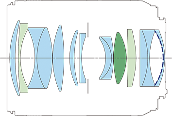 Optics specifications topInternal Optical Construction. Regular Optical Glass, Aspherical and UD glass elements. Dark-blue dashes show Sub-Wavelength Coating. 14 elements in 11 groups. 2 aspherical elements. 1 UD extra-low dispersion element, which help reduce secondary axial chromatic aberration. Internal focusing. Canon says it's rear focusing, however the focus groups are all inside the lens and neither the front nor rear elements move — good! Super Spectra multicoating, also a Sub-Wavelength Coating (SWC). Fluorine coating to resist dirt and smudges.
