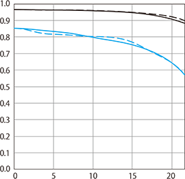Avoid f/11 and smaller unless you really need it for extreme depth of field because diffraction takes its toll. See also How to Calculate the Sharpest Aperture. MTF wide-open at f/1.4 at 10 cyc/mm (black) and 30 cyc/mm (blue). Sagittal (solid) and meridional (dashed). While it's usually valid to compare rated MTFs between different lenses of a similar age from the same maker, every maker measures or simply calculates MTF very differently, and therefore one cannot compare these curves between brands.