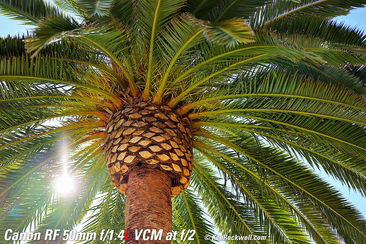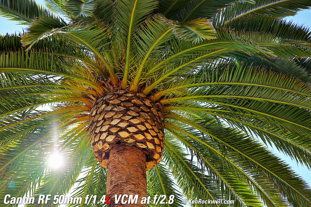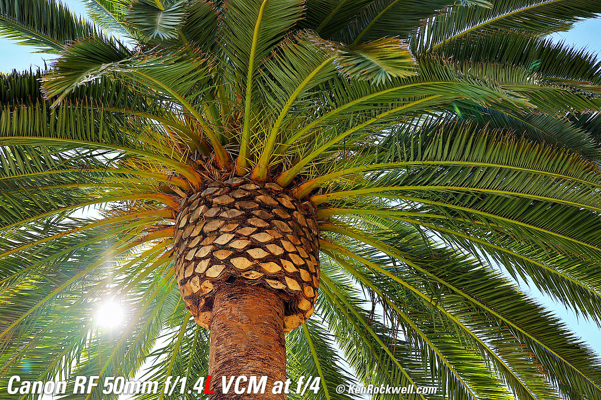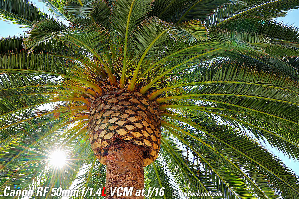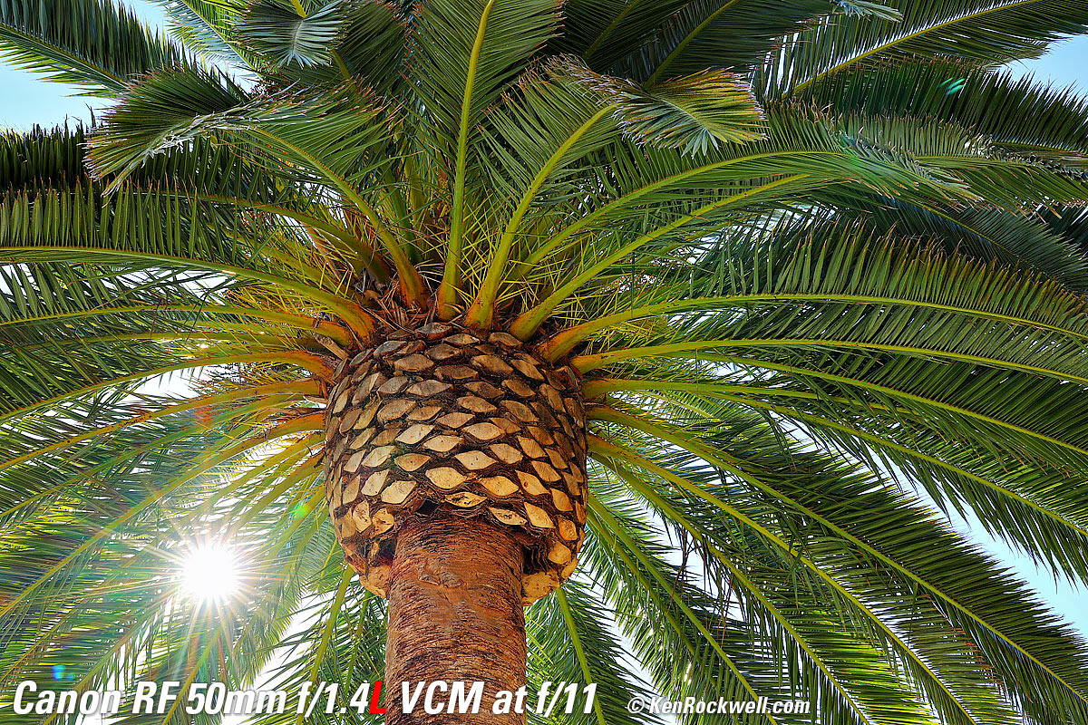 Sunstars performance topWith an 11-bladed rounded diaphragm, I get mild 22-point sunstars on brilliant points of light only at the smallest apertures. Ignore the vertical smear at large apertures. This is a sensor artifact called interline transfer smear and is a camera, not a lens, defect. Likewise ignore the crazy rainbow dots at small apertures; these are sensor artifacts caused by interference among the divisions between pixels on the sensor. These are made visible because we're using enough exposure to show the dark underside of a huge palm tree, and then putting the blinding disk of the mid-day sun in it. Doing this will show everything due to the insane lighting range. Click any to enlarge: Click any to enlarge.