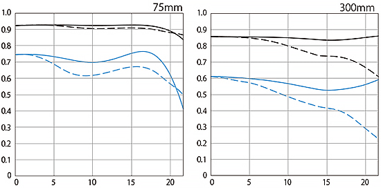 Sharpness performance topLens sharpness has nothing to do with picture sharpness; every lens made in the past 100 years is more than sharp enough to make super-sharp pictures if you know what you're doing and work within each lens' constraints. The only limitation to picture sharpness is your skill as a photographer. It's the least talented who spend the most time worrying about lens sharpness and blame crummy pictures on their equipment rather than themselves. Skilled photographers make great images with whatever camera is in their hands; I've made some of my best images of all time with an irreparably broken camera! Most pixels are thrown away before you see them, but camera makers don't want you to know that. If you're not getting sharp pictures with this, be sure to use an internally stabilized camera or a tripod, or at least shoot at or above 1/500 if hand-held. Don't shoot at f/16 or smaller where all lenses are softer due to diffraction, always shoot at ISO 100 or below because cameras become softer at ISO 200 and above, avoid shooting across long distances over land which can lead to atmospheric heat shimmer, be sure everything is in perfect focus, set your camera's sharpening as you want it (I set mine to the maximum) and be sure nothing is moving, either camera or subject. If you want to ensure a soft image with any lens, shoot at f/16 or smaller at ISO 1,600 or above at default sharpening in daylight of subjects at differing distances in the same image. Canon's MTF wide-open at 10 cyc/mm (black) and 30 cyc/mm (blue). Sagittal (radial) shown as solid lines, meridional (tangential) shown as dashed lines. Compared to other Canon lenses, this lens can be a bit softer wide-open, which is where you'll most likely be shooting unless you're using a tripod. While it's usually valid to compare rated MTFs between different lenses of similar vintage from the same maker, every maker measures or simply calculates MTF very differently, and therefore one cannot compare these curves between brands. For instance, Sony seems to ignore diffraction and simply calculate overly optimistic MTFs that hug 100%, which no real lens can do at f/8, while other brands are more realistic and include diffraction. Only Canon offers any insight on how they arrive at their curves. See also my article on MTF and Canon's article on MTFs.