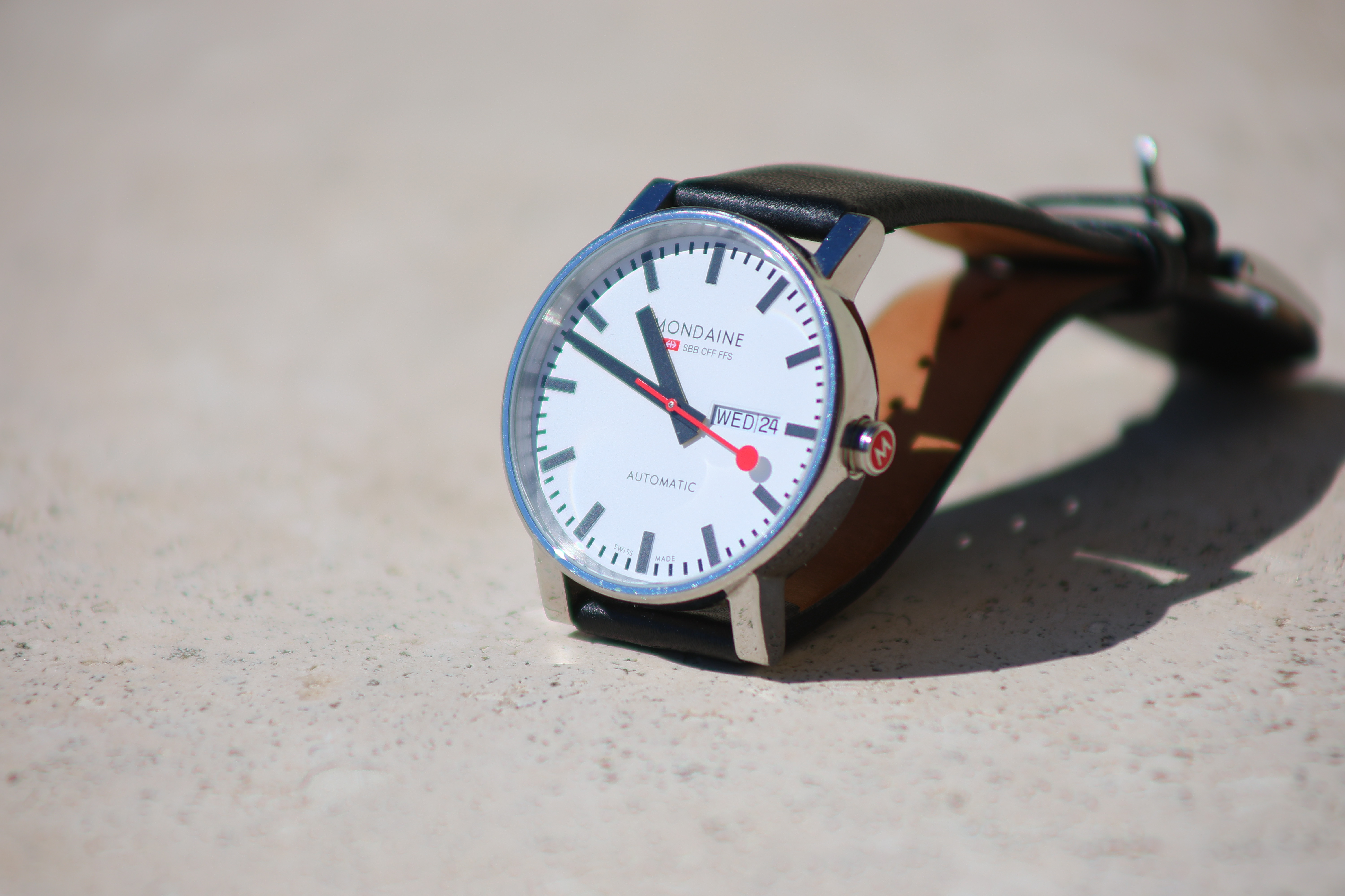 Spherochromatism performance topSpherochromatism, also called secondary spherical chromatic aberration or "color bokeh," is an advanced form of spherical and chromatic aberration in a different dimension than lateral chromatic aberration and therefore cannot be corrected with software or automatic corrections. It happens mostly in fast normal and tele lenses when spherical aberration at the ends of the color spectrum are corrected differently than in the middle of the spectrum. Spherochromatism can cause colored fringes on out-of-focus highlights, usually seen as green fringes on backgrounds and magenta fringes on foregrounds. Spherochromatism is common in fast lenses of moderate focal length when shooting contrasty items at full aperture. It goes away as stopped down. It has a modestly strong amount of spherochromatism, with yellow-green fringes behind and violet fringes ahead of the plane of perfect focus. Spherochromatism, like in many other older and inexpensive telephoto designs, is this lens' biggest optical limitation. Mondaine A132.30348.11SBB at close-focus distance, 24 September 2025. Canon EOS R1, RF 75-300mm at 300mm at f/5.6 at 1/1,000 at Auto ISO 100, +0.7 stops exposure compensation (LV 15.0). bigger or camera-original © file.