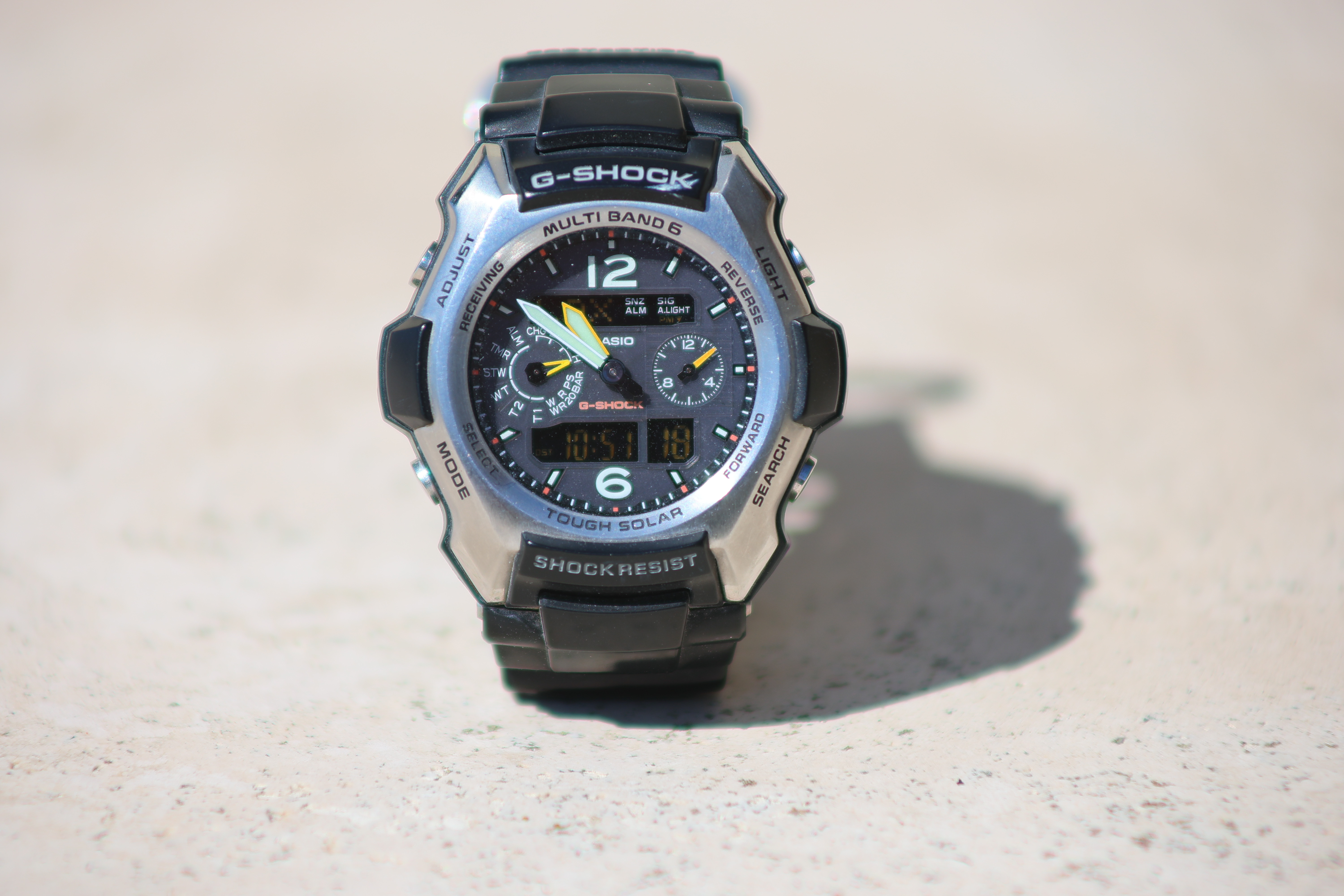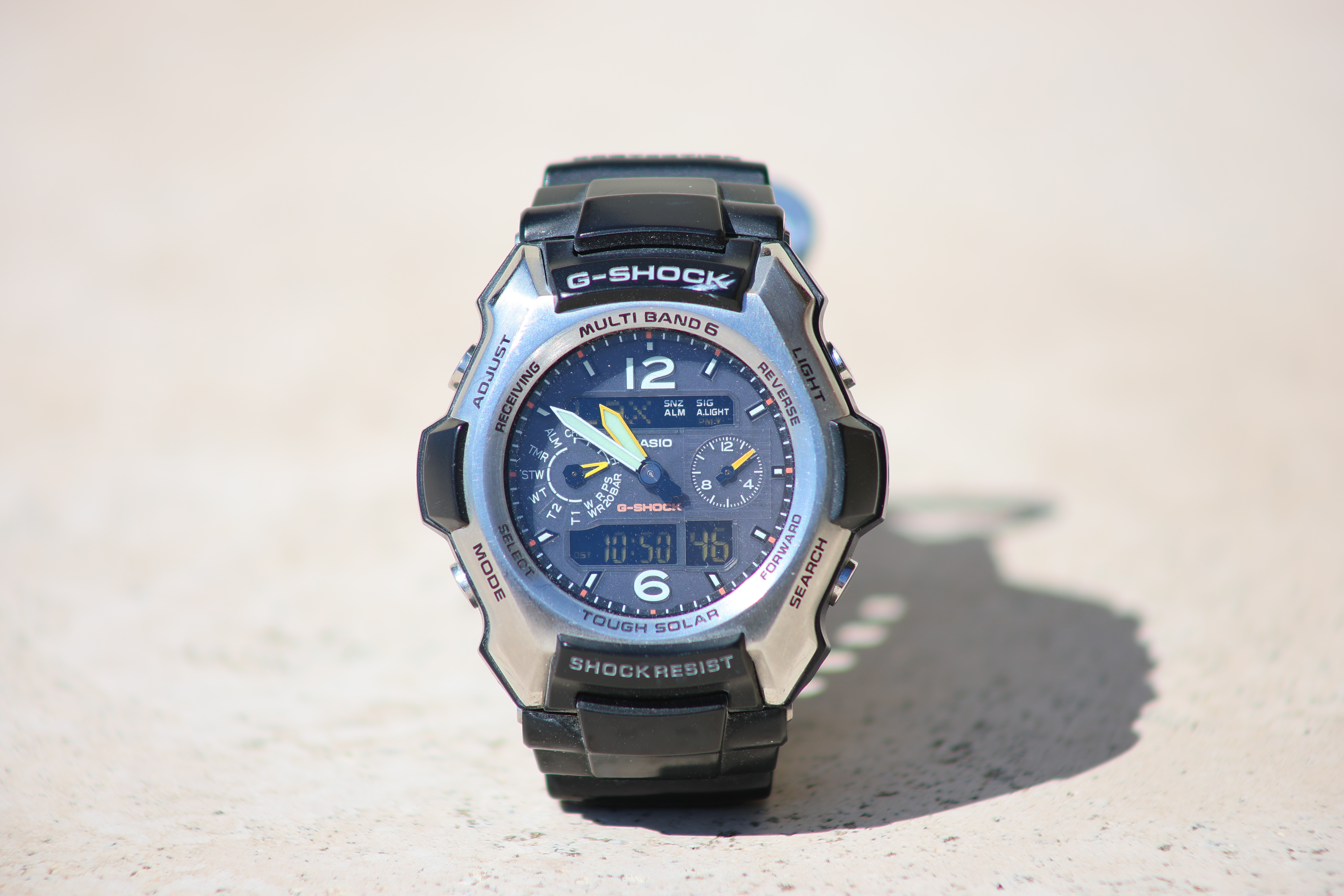 Wide-Open at f/5.6 at 300mmCasio G-Shock Solar Atomic Watch at close-focus distance, 24 September 2025. Canon EOS R1, RF 75-300mm at 300mm at f/5.6 at 1/500 at Auto ISO 100, +1.0 stops exposure compensation (LV 14.0). bigger or camera-original © file.
