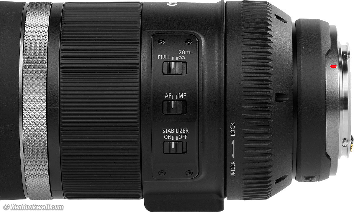 ControlsCanon 800mm f/11 IS STM. bigger. Full / 20m-∞ Switch user's guide topThis is a focus limiter. Leave it in FULL. The 20m-∞ position prevents the lens from autofocusing closer than 20 meters (60 feet). Use this setting only if you're having a problem with the lens attempting to focus on irrelevant close items, or if for some reason the lens is "hunting" from near to far while looking for distant subjects.