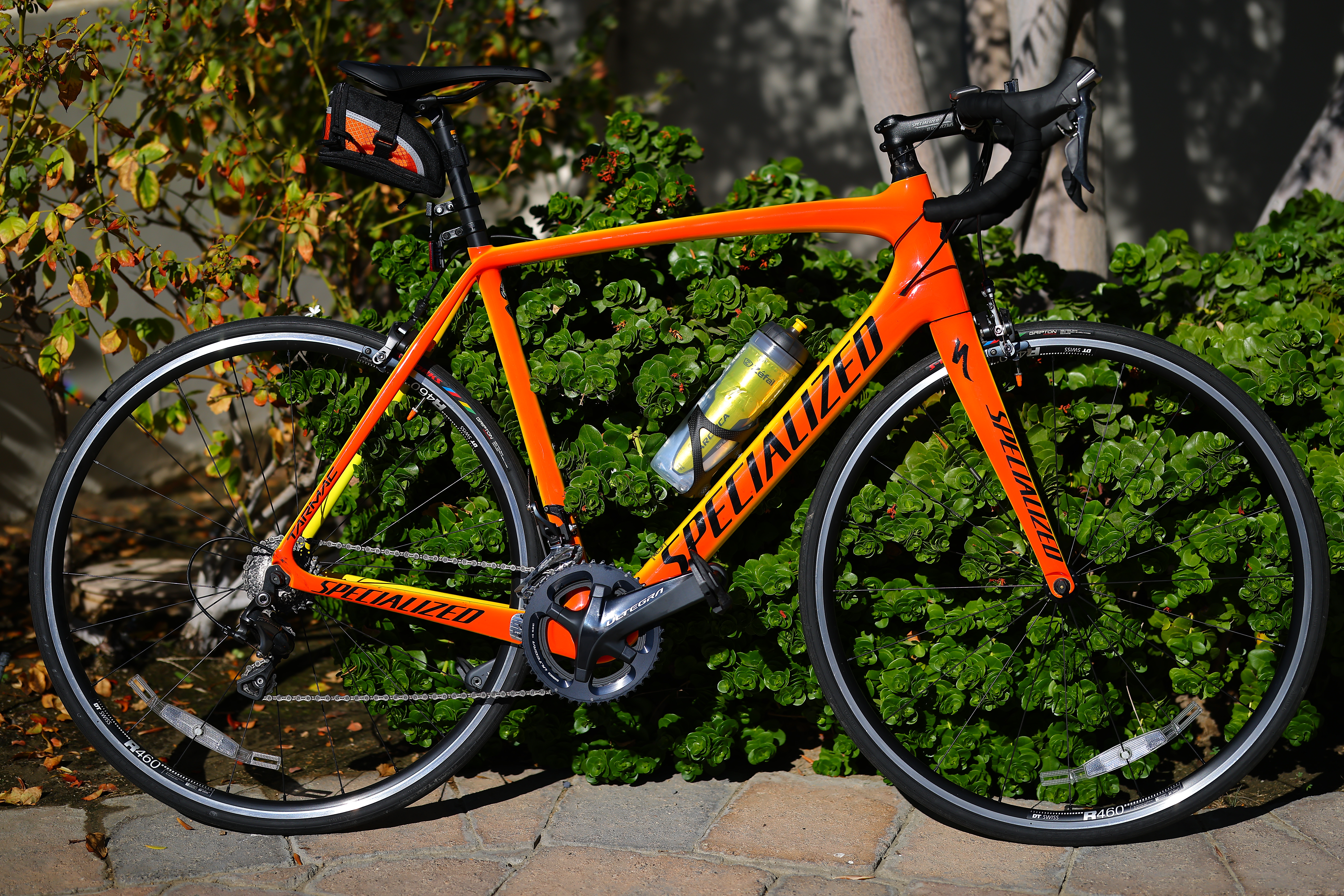 Wide-Open at f/1.2:2017 Specialized Tarmac Comp 58cm, Torch Edition with orange Presta valve caps, Shimano Dura-Ace CS-R9100 12-25T cassette, Shimano Integra FC-R8000 175mm 46-36T crankset and Shimano Dura-Ace PD-R9100 pedals, 8:54 AM, 09 August 2020. Canon EOS R5, Canon RF 85mm f/1.2L USM DS wide-open at f/1.2 at 1/6,400 at ISO 50, -2 stops exposure compensation to keep the brilliant torch orange from clipping the red channel (LV 14¼), as shot. bigger or camera-original © JPG file. How sharp is this combination of state-of-the art lens and camera? Sharp enough to read the fine print off my old tires, and this is wide-open at f/1.2 with about a half-inch (one cm) of depth-of-field! 1,200×900 pixel (6.8× magnification) crop from above. bigger or camera-original © JPG file. If this 1,200 × 900 pixel crop is about 3" (7.5cm) wide on your screen, the complete image would print at a large 14 × 21″ (35 × 55 cm) at this same high magnification. If this 1,200 × 900 pixel crop is about 6" (15cm) wide on your screen, the complete image would print at a huge 27½ × 41¼″ (2¼ × 3½ feet or 70 × 105 cm) at this same high magnification. If this 1,200 × 900 pixel crop is about 12" (30cm) wide on your screen, the complete image would print at a mammoth 55 × 82½″ (4½ × 7 feet or 1.4 × 2.1 meters) at this same extremely high magnification — larger than life-sized!!!