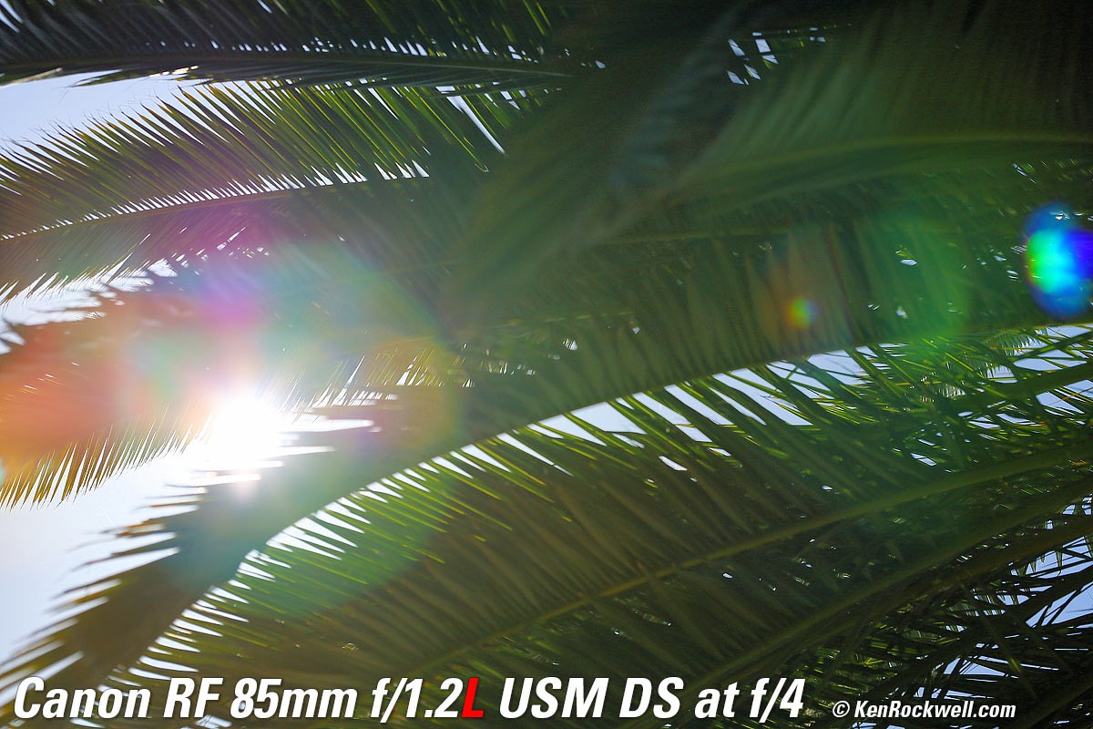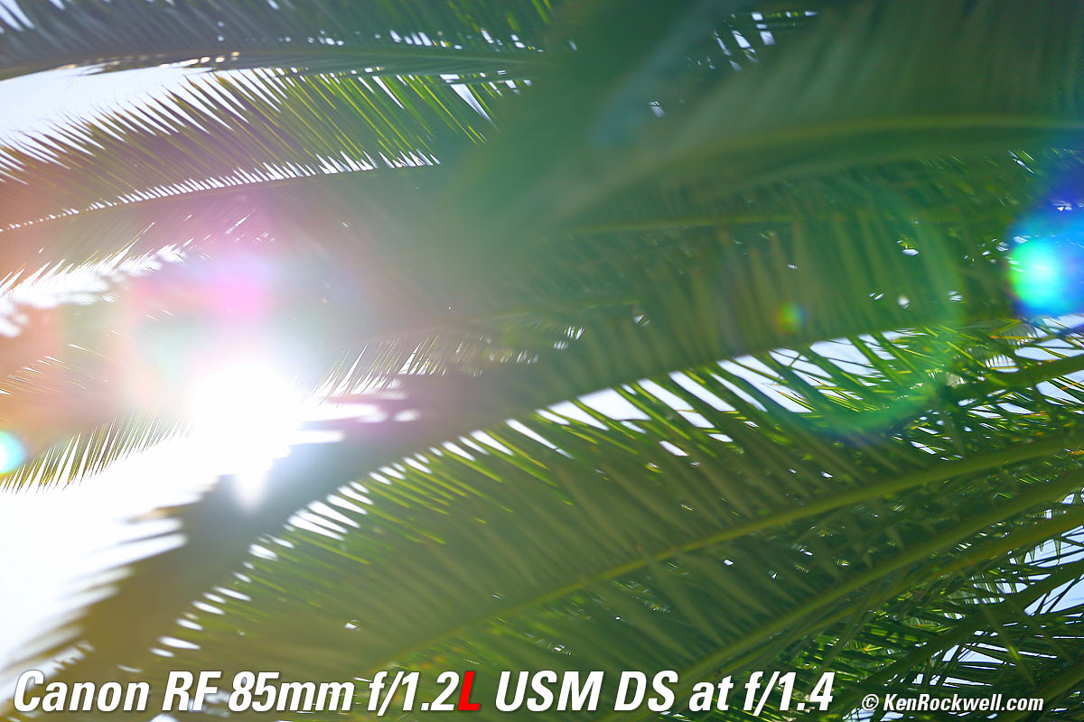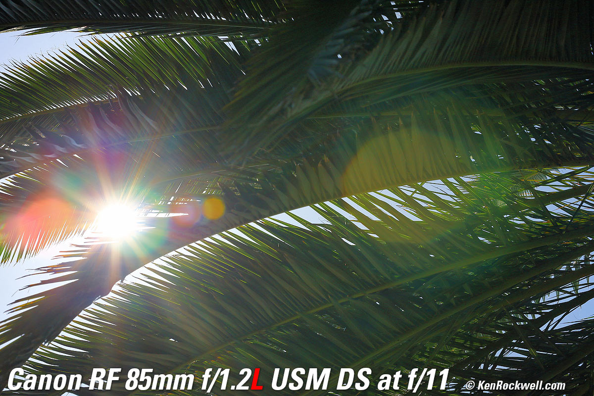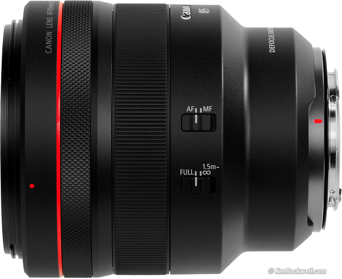 Recommendations topSample Images Intro Compatibility Specifications Performance Compared I got my 85/1.2L DS at B&H. I'd also get mine at Adorama, at Amazon or at at Crutchfield, or used at eBay if you know How to Win at eBay. If you want an ultra-ultrasharp lens with soft, melt-away backgrounds, this is the world's best. This is a special-purpose lens expressly for people who demand the softest possible out-of-focus areas. It's not a high-speed lens, as the internal neutral-density filters make this lens slower than f/1.2 (about T2). The effects of the internal filters go away at smaller apertures. If you want the same ultra sharpness but want the high speed of f/1.2 with not quite as soft backgrounds, instead get the regular RF 85mm f/1.2L. I use a clear (UV) protective filter instead of a cap so I'm always ready to shoot instantly. I only use a cap when I throw this in a bag with other gear without padding — which is never. The UV filter never gets in the way, and never gets lost, either. The very best protective filter is the 82mm Hoya multicoated HD3 UV which uses hardened glass and repels dirt and fingerprints. For less money, the B+W 82mm 010 is an excellent filter, as is the multicoated version and the Hoya Alpha filter, but the Hoya HD3 is the toughest and the best. Any of these filters protects as well and gives ultrasharp images, but since filters last a lifetime, you may as well get the best since the Hoya HD3 is tougher and stays cleaner than the others since it repels oil and dirt. I got my 85/1.2L DS at B&H. I'd also get mine at Adorama, at Amazon or at at Crutchfield, or used at eBay if you know How to Win at eBay. This 100% all-content website's biggest source of support is when you use those or any of these links to approved sources when you get anything, regardless of the country in which you live. Canon does not seal its boxes in any way, so especially with an exotic lens like this never buy at retail or any other source not on my personally approved list since you'll have no way of knowing if you're missing accessories, getting a defective, damaged, returned, non-USA, store demo or used lens. I use the stores I do because they ship from secure remote warehouses where no one gets to touch your new camera before you do. Buy only from the approved sources I use myself for the best prices, service, return policies and selection. Thanks for helping me help you! Ken Rockwell