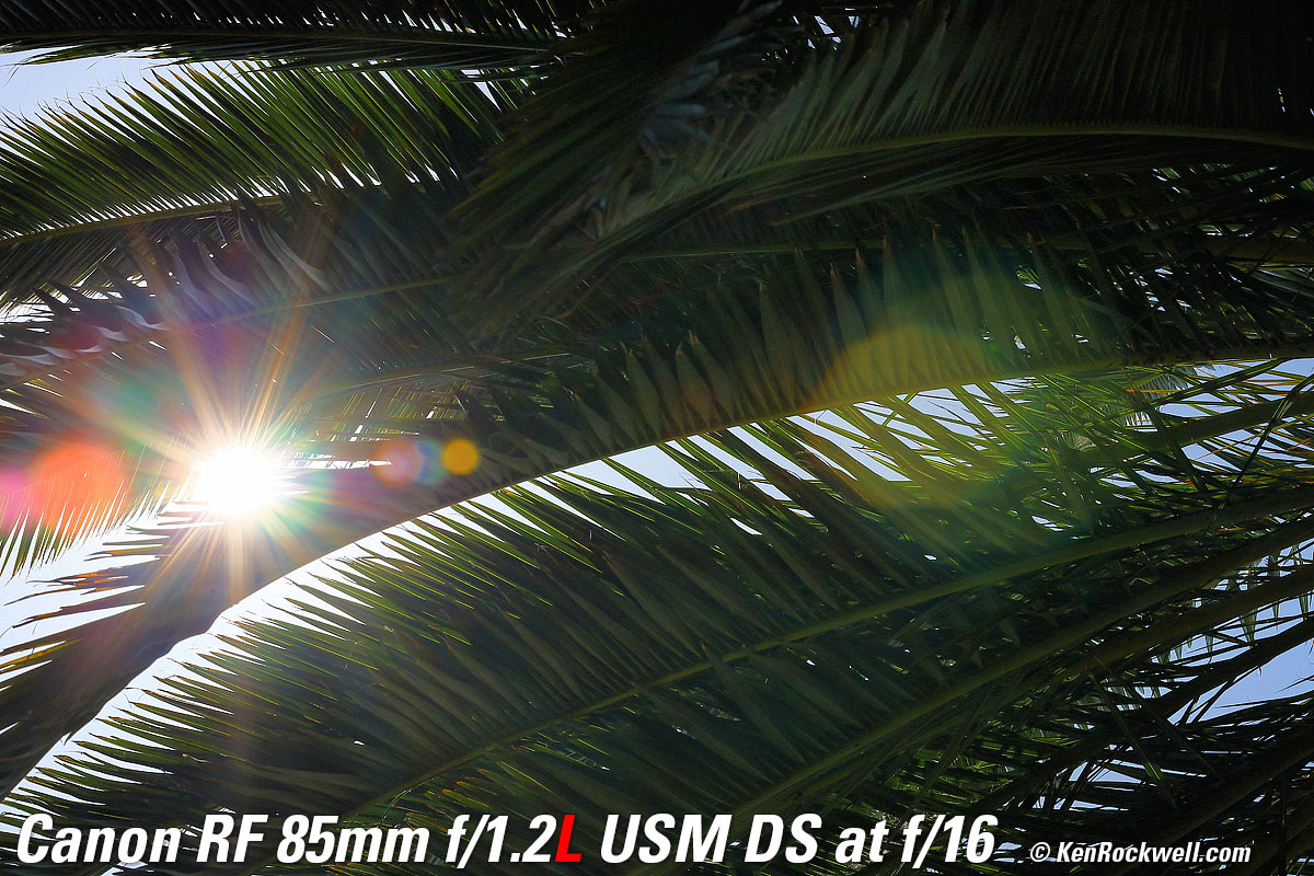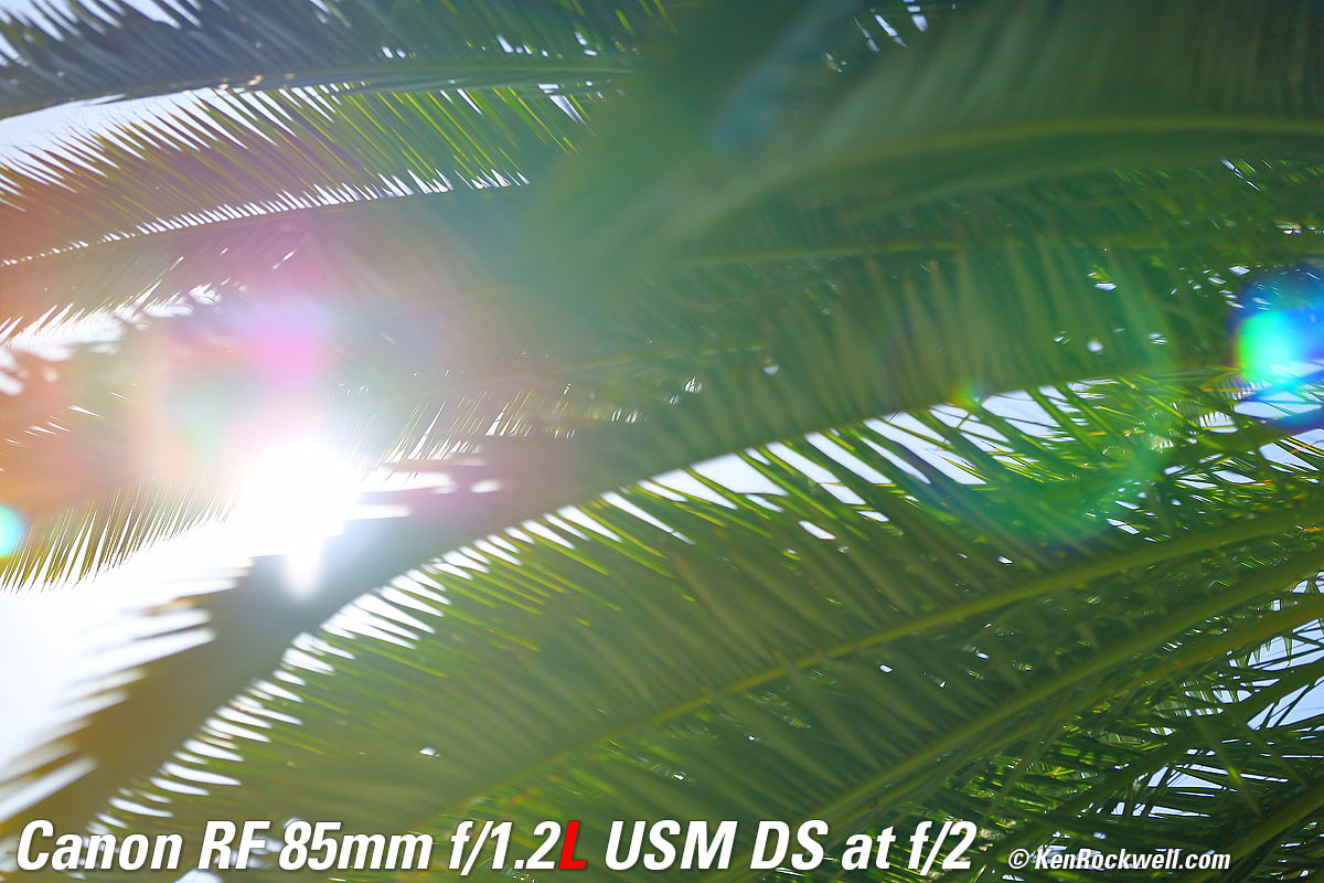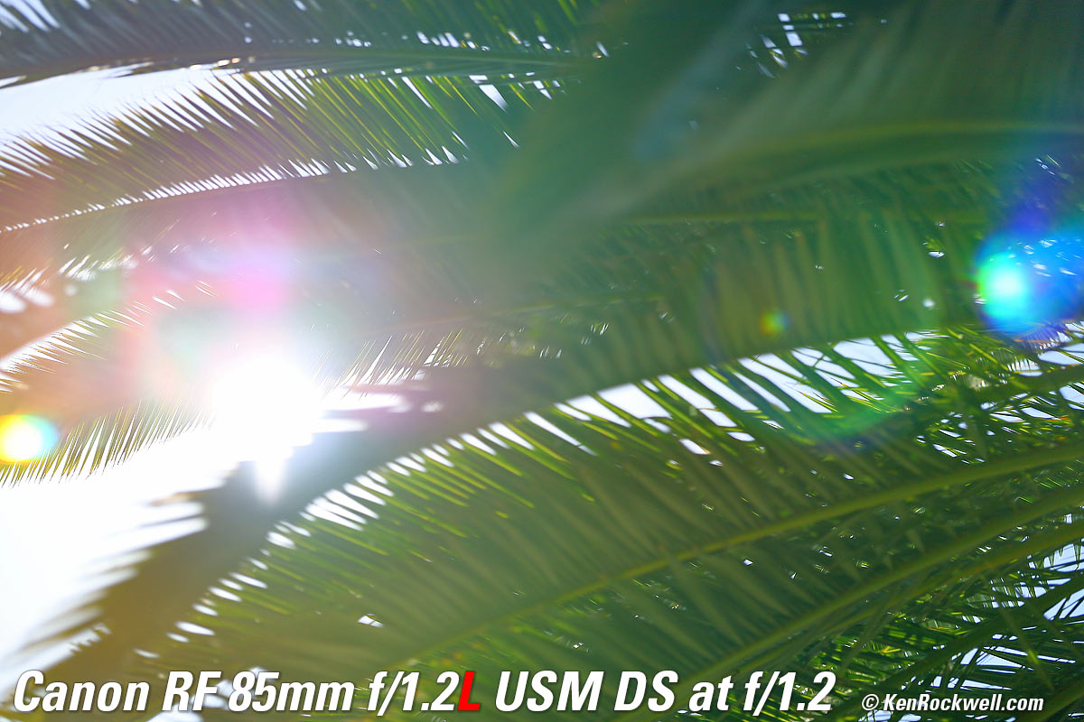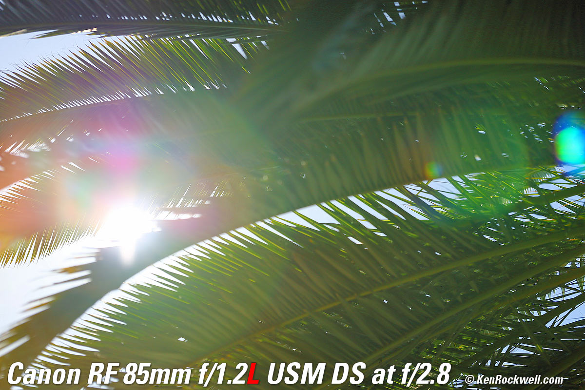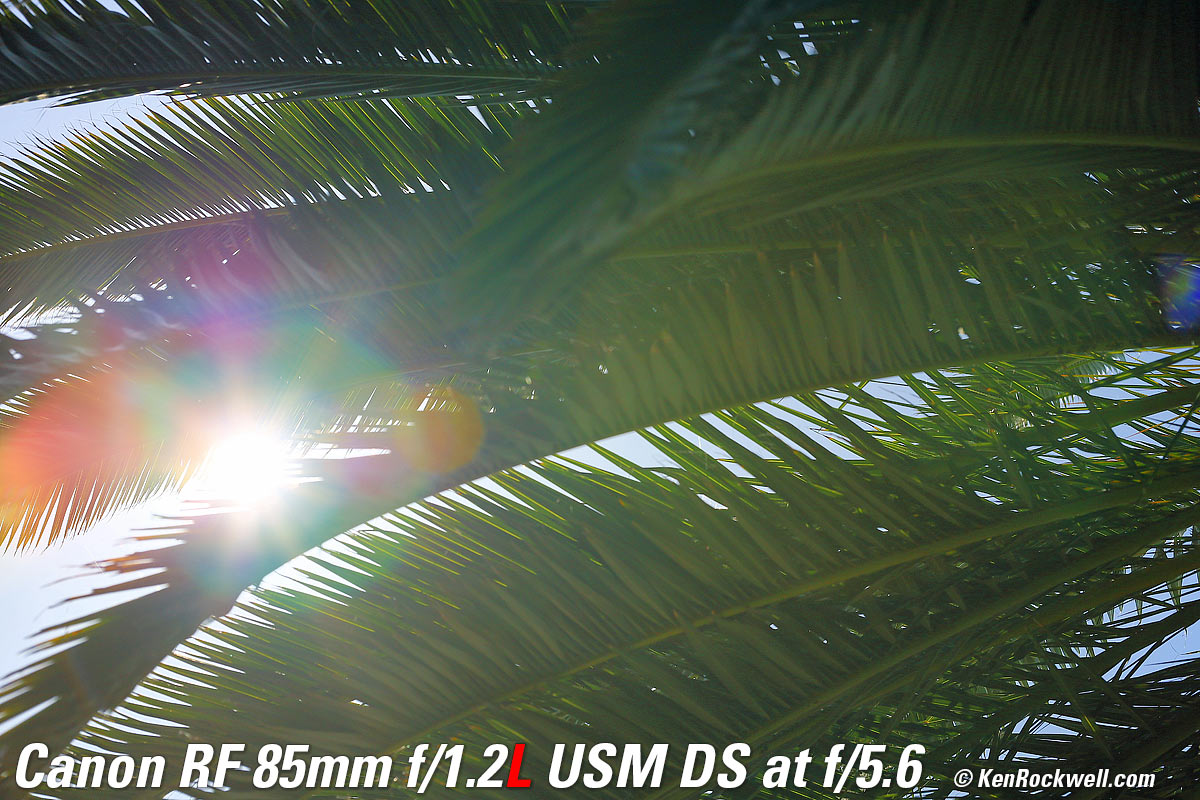 Recommendations topSample Images Intro Compatibility Specifications Performance Compared I got my 85/1.2L DS at B&H. I'd also get mine at Adorama, at Amazon or at at Crutchfield, or used at eBay if you know How to Win at eBay. If you want an ultra-ultrasharp lens with soft, melt-away backgrounds, this is the world's best. This is a special-purpose lens expressly for people who demand the softest possible out-of-focus areas. It's not a high-speed lens, as the internal neutral-density filters make this lens slower than f/1.2 (about T2). The effects of the internal filters go away at smaller apertures. If you want the same ultra sharpness but want the high speed of f/1.2 with not quite as soft backgrounds, instead get the regular RF 85mm f/1.2L. I use a clear (UV) protective filter instead of a cap so I'm always ready to shoot instantly. I only use a cap when I throw this in a bag with other gear without padding — which is never. The UV filter never gets in the way, and never gets lost, either. The very best protective filter is the 82mm Hoya multicoated HD3 UV which uses hardened glass and repels dirt and fingerprints. For less money, the B+W 82mm 010 is an excellent filter, as is the multicoated version and the Hoya Alpha filter, but the Hoya HD3 is the toughest and the best. Any of these filters protects as well and gives ultrasharp images, but since filters last a lifetime, you may as well get the best since the Hoya HD3 is tougher and stays cleaner than the others since it repels oil and dirt. I got my 85/1.2L DS at B&H. I'd also get mine at Adorama, at Amazon or at at Crutchfield, or used at eBay if you know How to Win at eBay. This 100% all-content website's biggest source of support is when you use those or any of these links to approved sources when you get anything, regardless of the country in which you live. Canon does not seal its boxes in any way, so especially with an exotic lens like this never buy at retail or any other source not on my personally approved list since you'll have no way of knowing if you're missing accessories, getting a defective, damaged, returned, non-USA, store demo or used lens. I use the stores I do because they ship from secure remote warehouses where no one gets to touch your new camera before you do. Buy only from the approved sources I use myself for the best prices, service, return policies and selection. Thanks for helping me help you! Ken Rockwell