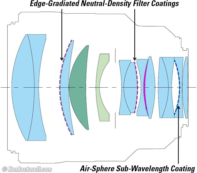Optics specifications topCanon RF 85mm f/1.2L USM DS internal optical construction. Regular Optical Glass, UD glass and Ground Aspherical elements and Blue-Spectrum Refractive Compound. bigger. 13 elements in 9 groups. 1 UD extra-low dispersion element, which helps reduce secondary axial chromatic aberration. 1 Ground Aspherical element. Vapor-deposited edge-graduated neutral-density filter coatings to soften blur circle edges at f/1.2. (Ineffective at smaller apertures.) Blue-Spectrum Refractive Compound squirted in the airspace between two elements to reduce secondary axial chromatic aberration and spherochromatism: