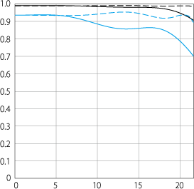 Sharpness performance topLens sharpness has nothing to do with picture sharpness; every lens made in the past 100 years is more than sharp enough to make super-sharp pictures if you know what you're doing. The only limitation to picture sharpness is your skill as a photographer. It's the least talented who spend the most time worrying about lens sharpness and blame crummy pictures on their equipment rather than themselves. Skilled photographers make great images with whatever camera is in their hands; I've made some of my best images of all time with an irreparably broken camera! Most pixels are thrown away before you see them, but camera makers don't want you to know that. If you're not getting ultra-sharp pictures with this, be sure not to shoot at f/11 or smaller where all lenses are softer due to diffraction, always shoot at ISO 100 or below because cameras become softer at ISO 200 and above, avoid shooting across long distances over land which can lead to atmospheric heat shimmer, be sure everything is in perfect focus, set your camera's sharpening as you want it (I set mine to the maximum: 7,5,5) and be sure nothing is moving, either camera or subject. If you want to ensure a soft image with any lens, shoot at f/16 at ISO 6,400 at default sharpening in daylight of subjects at differing distances in the same image. As the MTF chart confirms, the 85/1.2 DS is essentially flawless: Canon RF 85 1.2 DS MTF wide-open at 10 cyc/mm (black) and 30 cyc/mm (blue). Sagittal (solid) and meridional (dashed).