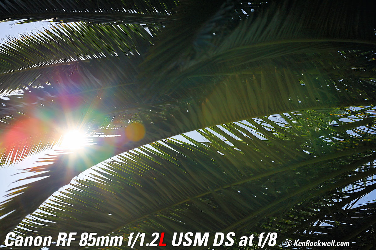 Sunstars performance topWith a 9-bladed rounded diaphragm, I don't see much in the way of sunstars on the sun. You may get better on distant points of light at night because they are points rather than the big sun through this telephoto lens. Ignore the crazy rainbow effects; these are sensor artifacts caused by taking a picture directly of the sun and exposing for the dark underside of the palm tree. Likewise the vertical smear at larger apertures is another sensor artifact called interline transfer smear; it's not a lens defect. Click any to enlarge: Click any to enlarge.