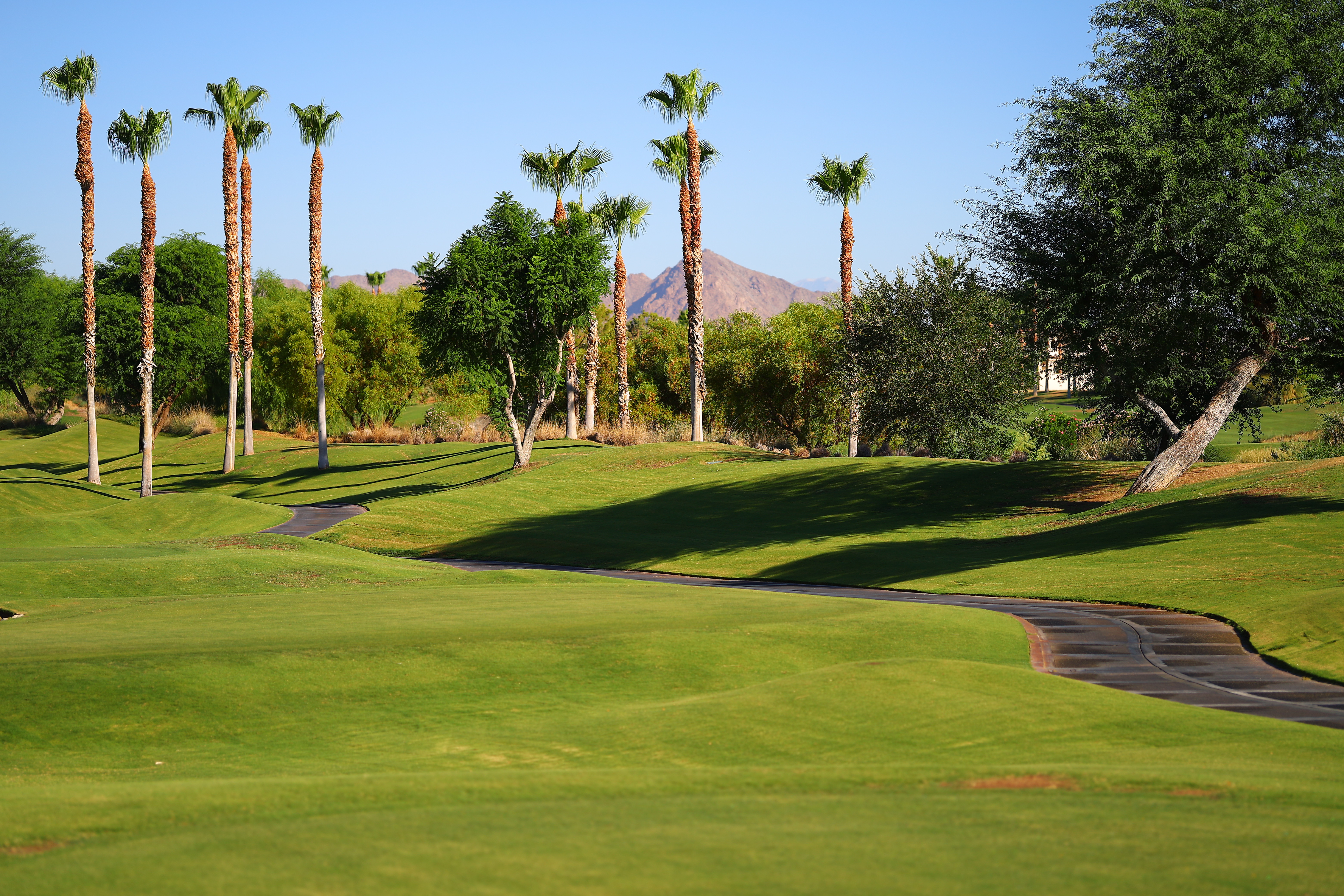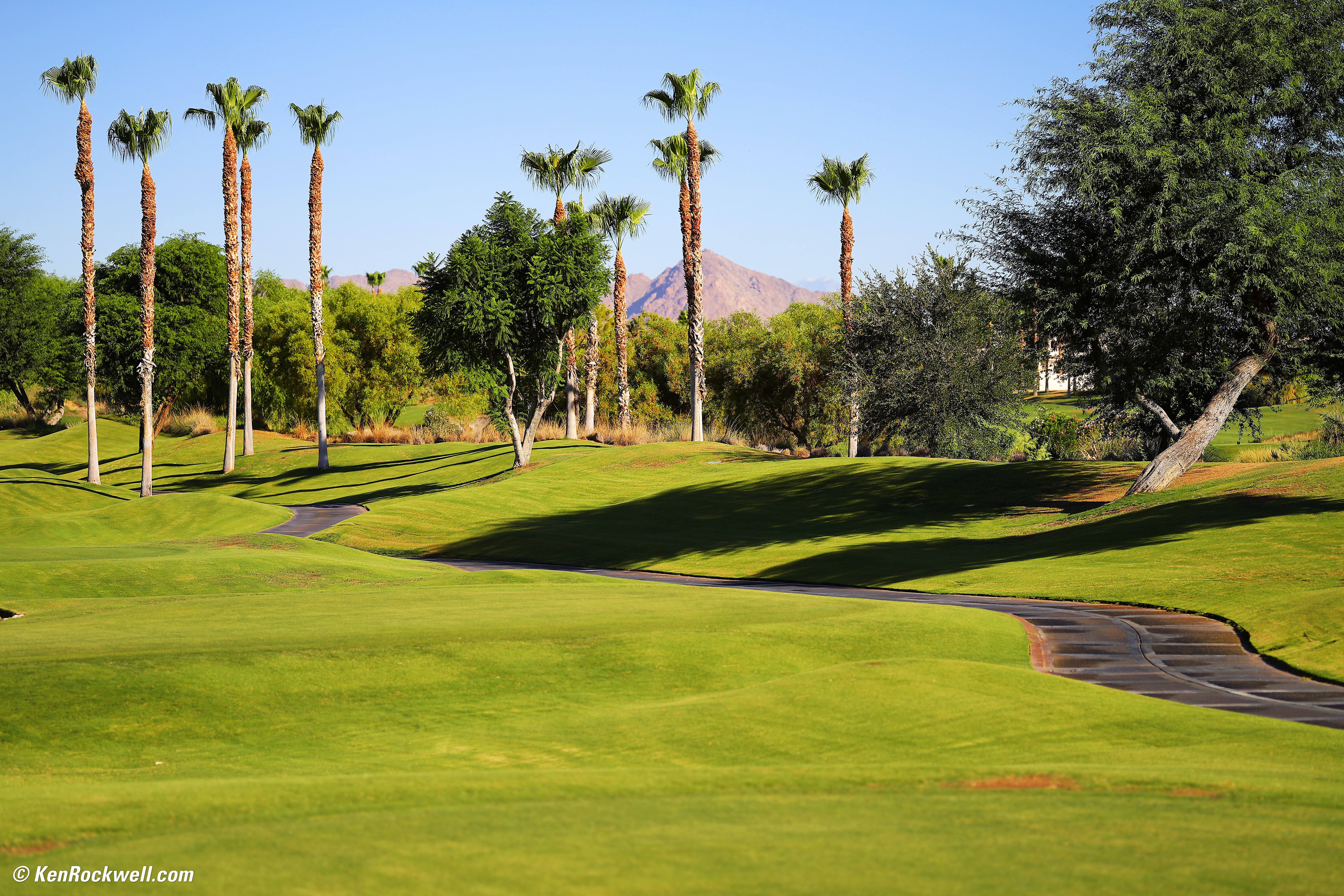 Wide-Open at f/1.2:Desert Golf Course, 8:19 AM, 18 July 2020. Canon EOS RP, Canon RF 85mm f/1.2L USM DS wide-open at f/1.2 at 1/2,500 at ISO 50 (LV 13.0), Perfectly Clear. bigger, full-resolution or camera-original © JPG file. Remember, at f/1.2 even at this distance the depth-of-field is only about three feet. The foreground and the background are supposed to be soft; only some of the palm trees and the tree on the right are in any sort of focus. Introduction topSample Images Intro Compatibility Specifications Performance Compared