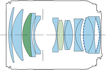 Optics specifications topInternal Optical Construction. Regular Optical Glass, UD glass and Aspherical elements. Dark-blue dashes show Air Sphere (Sub-Wavelength) Coating. 14 elements in 10 groups. 1 UD extra-low dispersion element, which help reduce secondary axial chromatic aberration. 1 aspherical element. Internal focusing. The focus groups are all inside the lens and neither the front nor rear elements move — good! Super Spectra multicoating, also Air Sphere Sub-Wavelength Coatings (SWC). Fluorine coating to resist dirt and smudges.