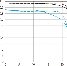 Avoid f/11 and smaller unless you really need it for extreme depth of field because diffraction takes its toll. See also How to Calculate the Sharpest Aperture. MTF wide-open at f/1.4 at 10 cyc/mm (black) and 30 cyc/mm (blue). Sagittal (solid) and meridional (dashed). While it's usually valid to compare rated MTFs between different lenses of similar vintage from the same maker, every maker measures or simply calculates MTF very differently, and therefore one cannot compare these curves between brands. For instance, Sony seems to ignore diffraction and simply calculate overly optimistic MTFs that hug 100%, which no real lens can do at f/8, while other brands are more realistic and include diffraction. Only Canon offers any insight on how they arrive at their curves. See also my article on MTF and Canon's article on MTFs.