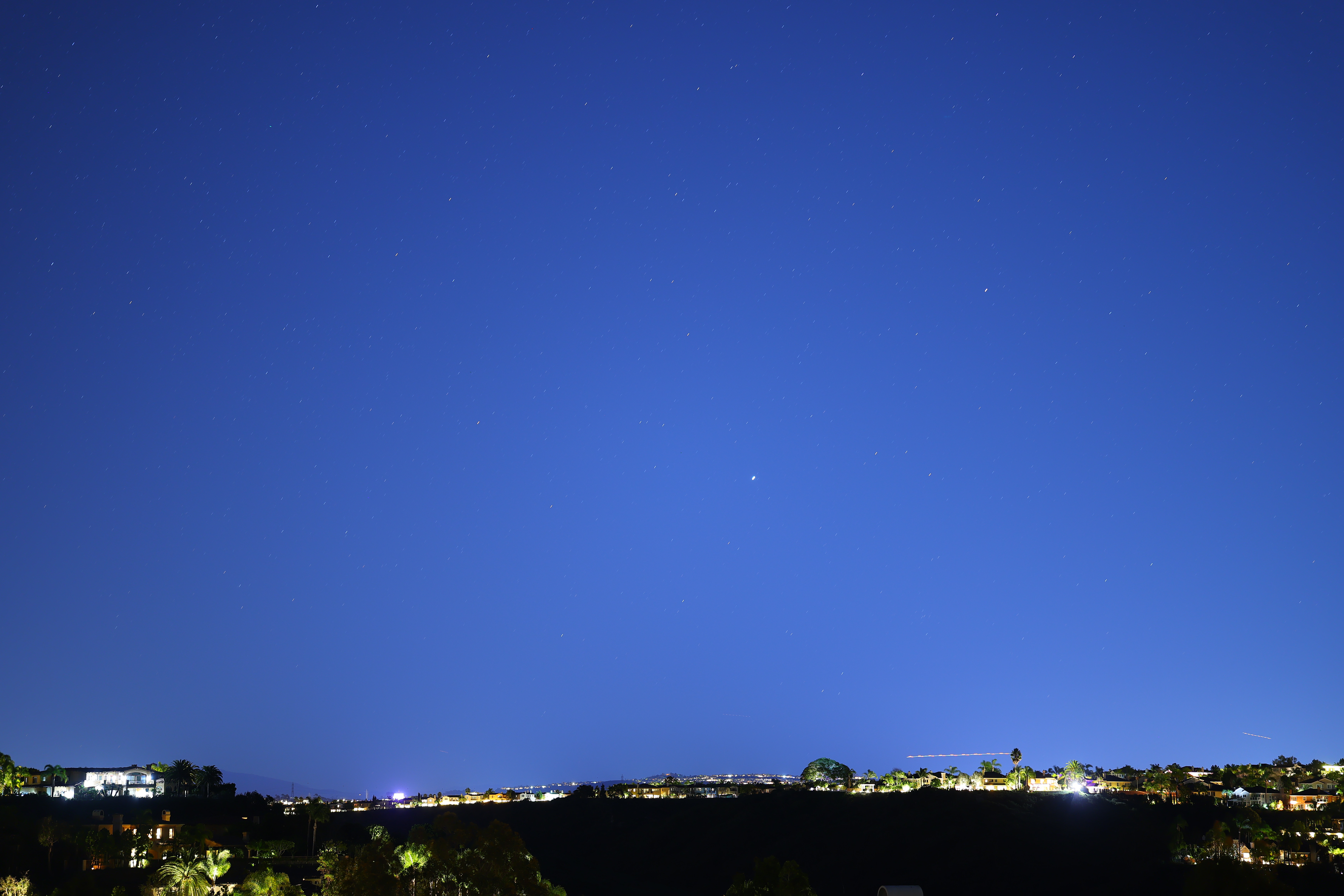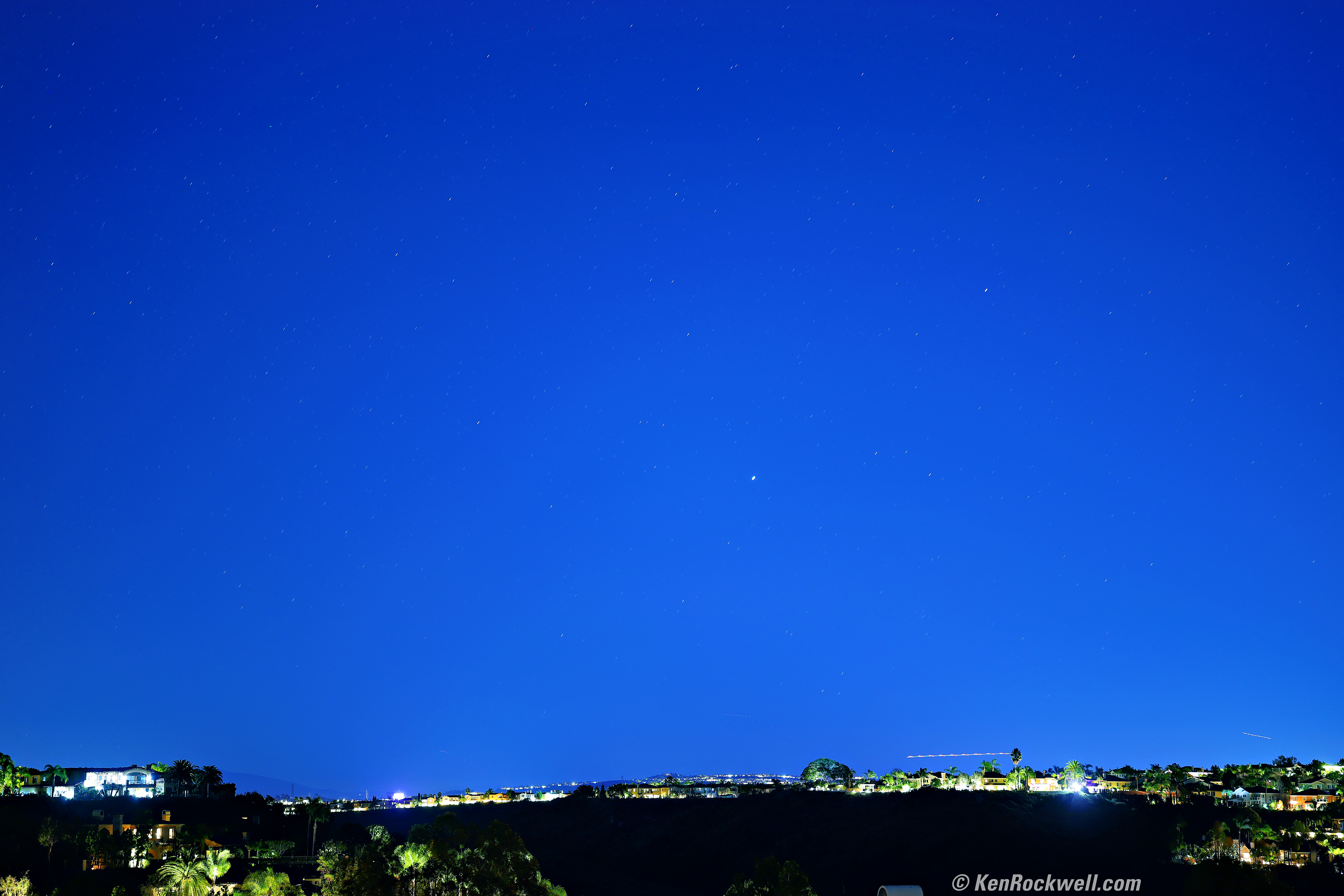 Coma performance topComa, or sagittal coma flare, is often seen at large apertures with fast normal to wide lenses as weird batwing shapes on bright points of light in the corners at night. They go away as stopped down. This RF 85mm f/1.4L is superb: there is no coma even at f/1.4 far in the corners. Bright points of light remain as bright points of light. Bravo!!! Nacht, 6:31 PM Saturday, 10 January 2026. Canon EOS R6 III, Canon RF 85mm f/1.4LVCM at f/1.4 for 13 seconds at ISO 100 (LV -2.6, or minus 2.6!), Radiant Photo software to add light. bigger, full-resolution image or 32 MP © camera-original 3 MB JPG file.
