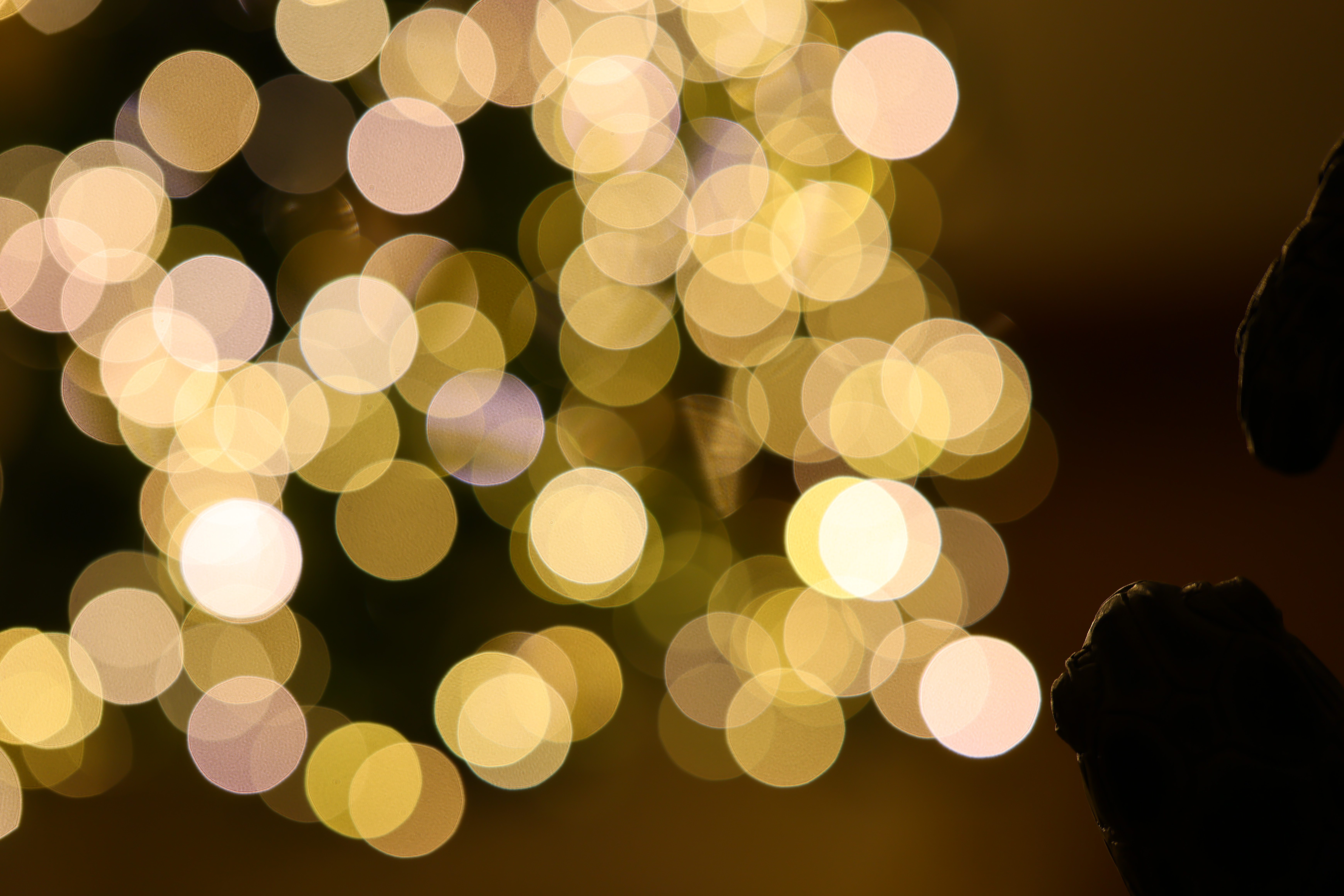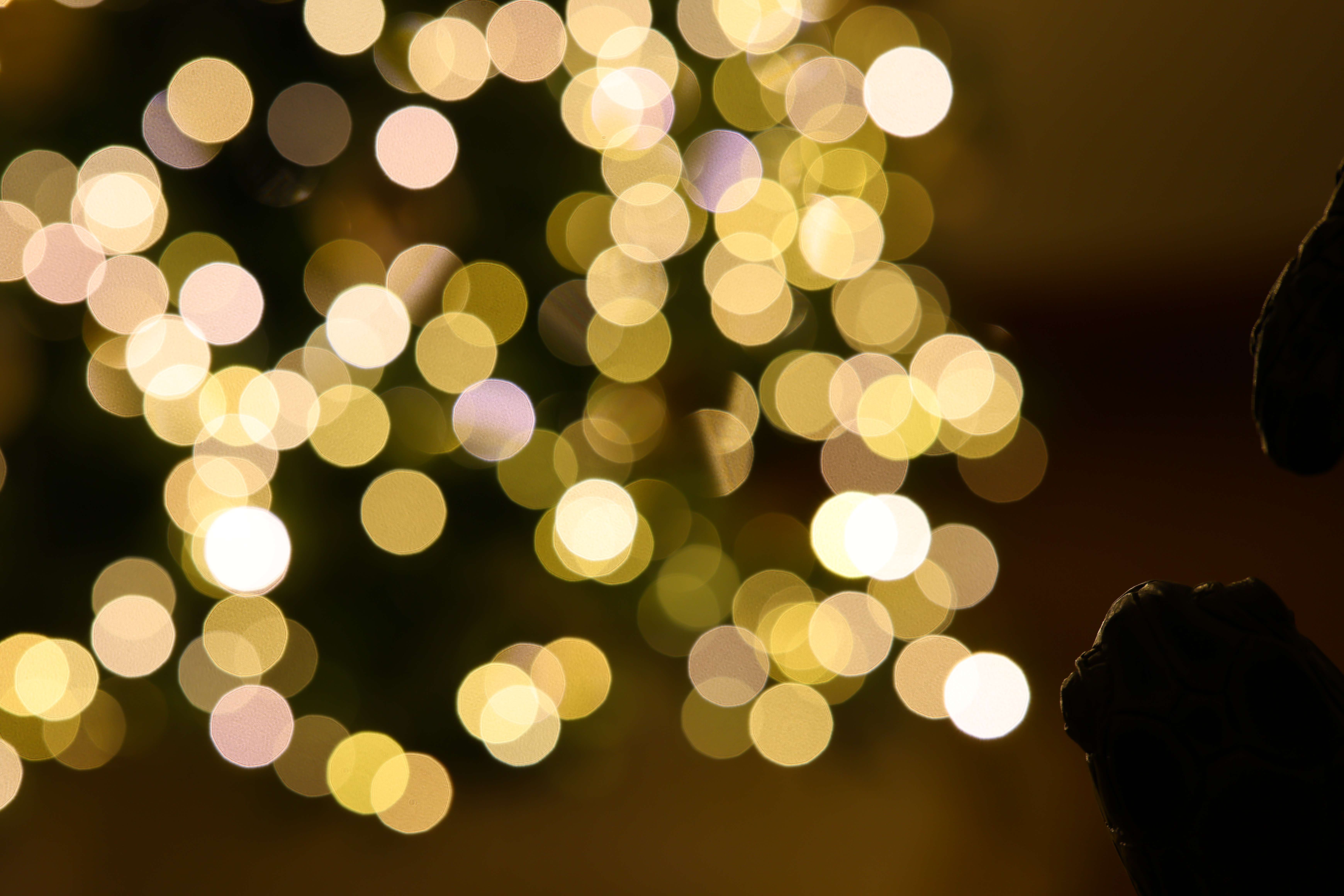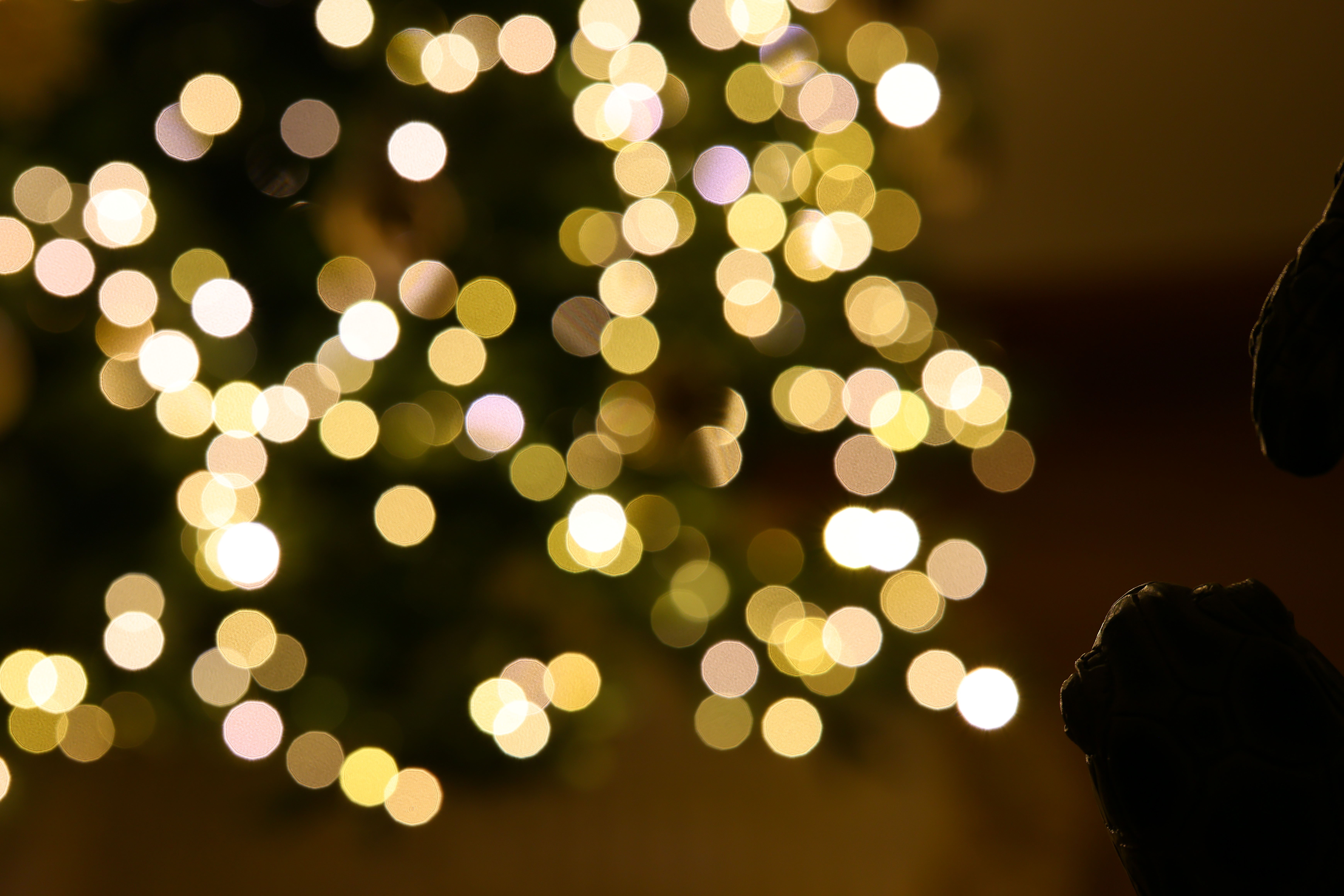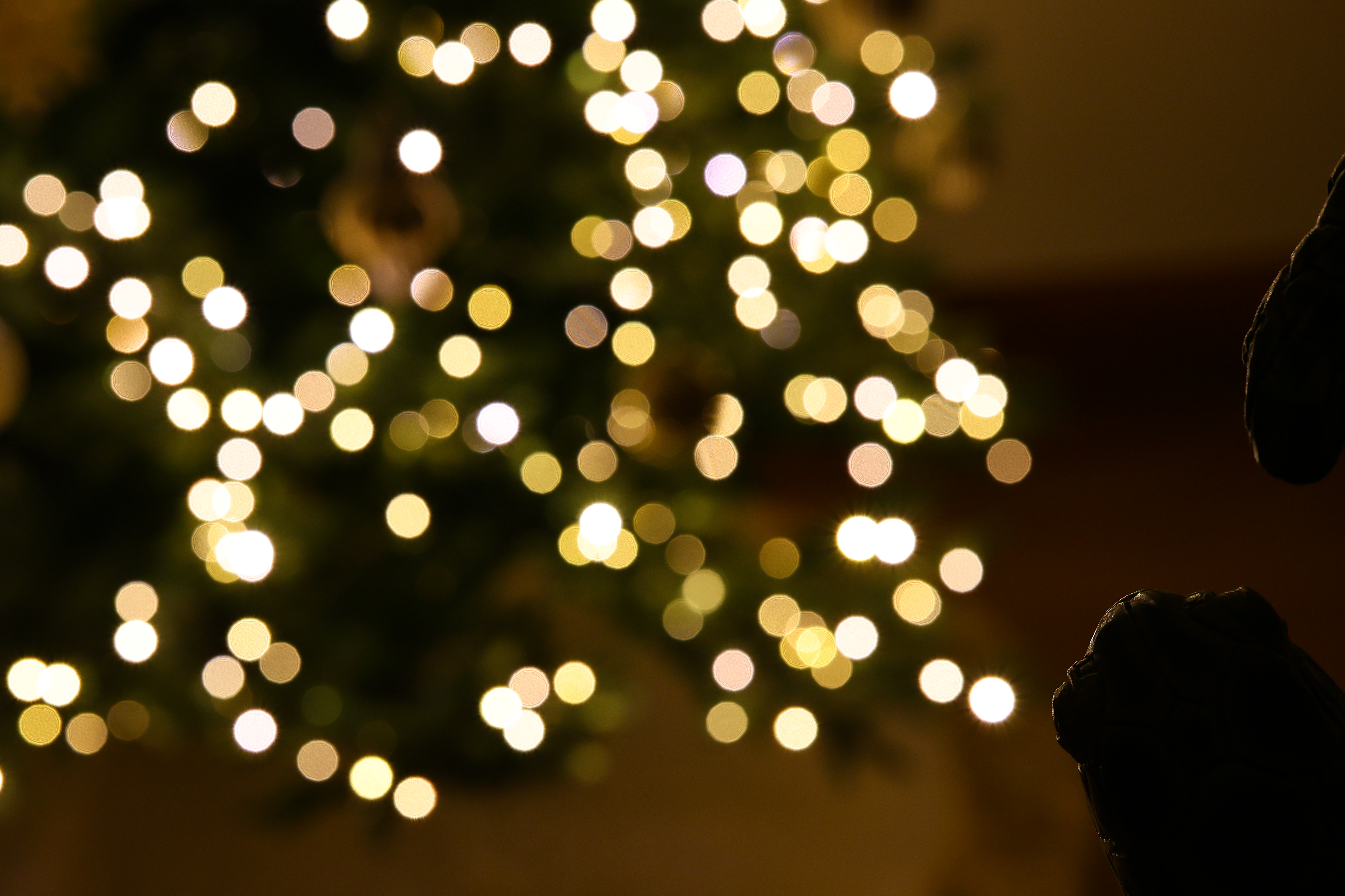Here are shots showing blur circles. I'm focused on the turtle head on the lower right at about one meter (three feet) while my Christmas tree is at about 3 meters (ten feet) away. Click any for the © camera-original file: Rockwell's Christmas Tree, 8:12 PM, Sunday, 11 January 2026. Canon EOS R6 III, Canon RF 85mm f/1.4L VCM at 1/50, 1/25, 1/15, 1/15 and 1/15 at Auto ISO 100, 100, 125, 250 and 500 (LV 6.6, 6.6, 6.7, 6.7 and 6.7), exactly as shot. Click any for the 32 MP © 4 MB camera-original JPG file. These are great, even, circular blur circles. Even stopped down at the larger apertures they remain circular. I do see some slight "onion ring" effects due to how the aspherical element is manufactured, but you won't see this in any real photo of anything other than out-of-focus point sources. As always, if you want to throw the background as far out of focus as possible, shoot at f/1.4 and get as close as possible.