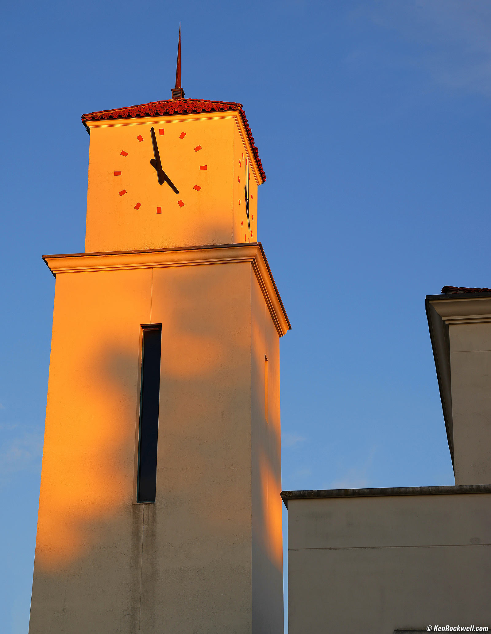 University Clock Tower in Last Light, 4:58 PM, Friday, 16 January 2026. Canon EOS R6 III, Canon RF 85mm f/1.4L VCM at f/4.5 at 1/250 at Auto ISO 100, -0.3 stops exposure compensation (LV 13.4), Skylum Luminar Neo software to erase extra trees. bigger.