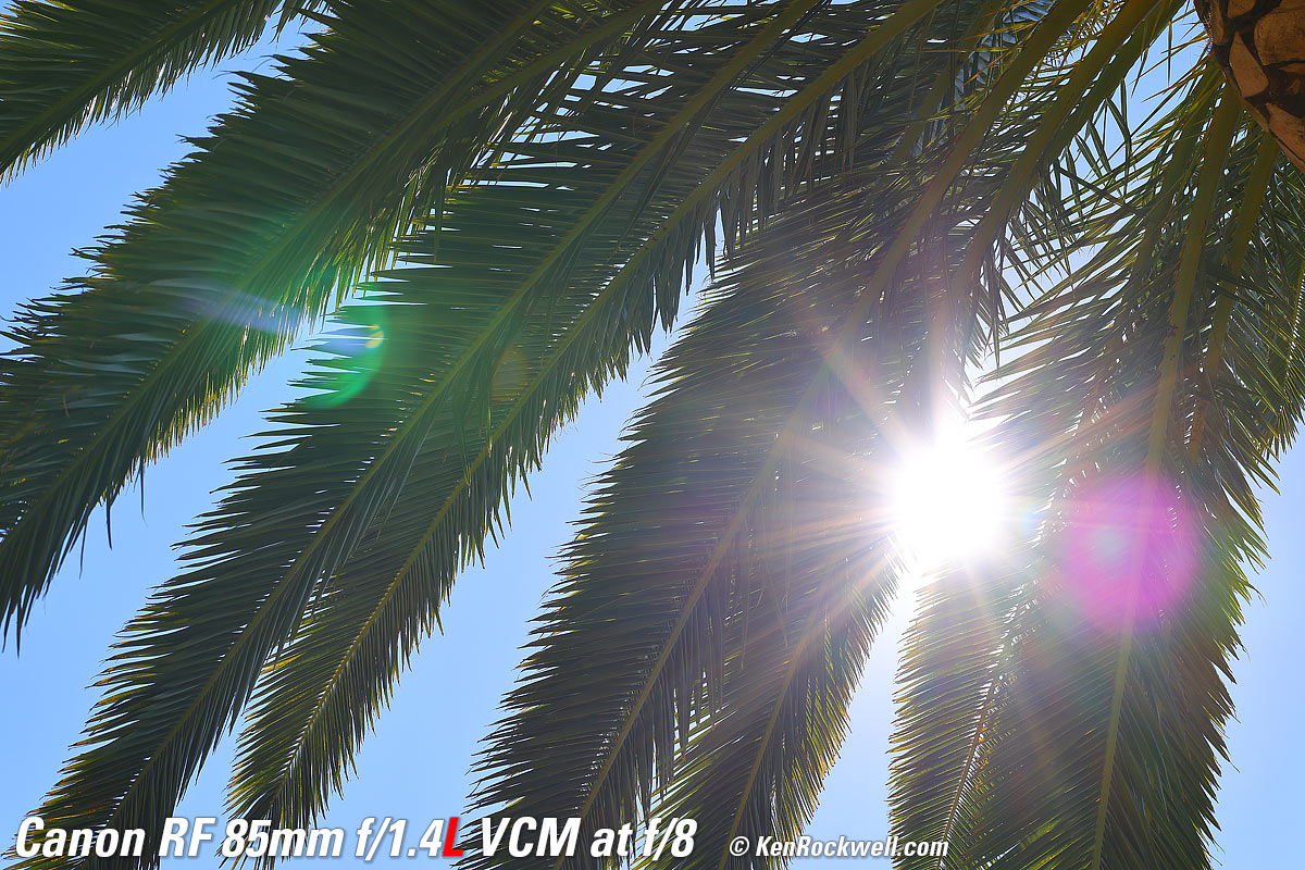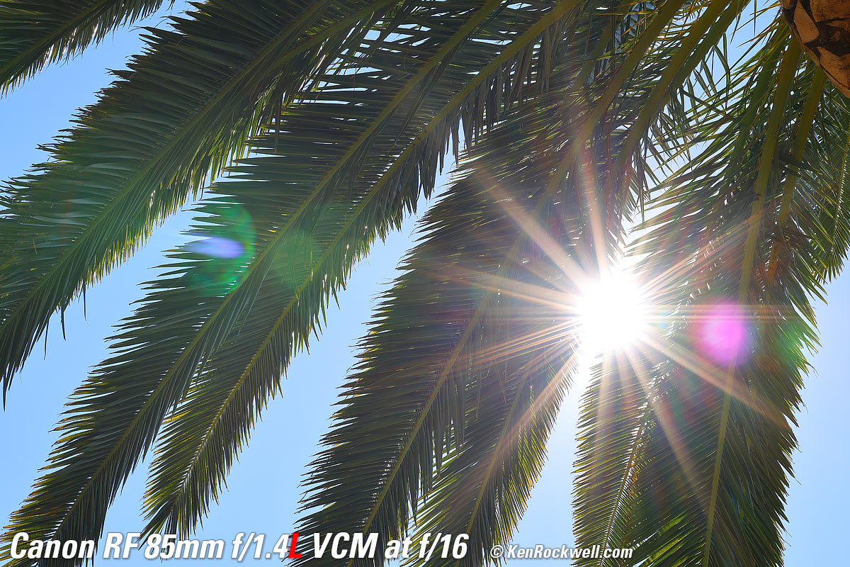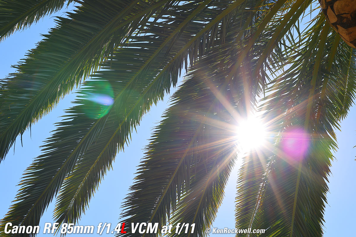 Sunstars performance topWith an 11-bladed rounded diaphragm, I get mild 22-point sunstars on brilliant points of light only at the smallest apertures. Ignore the vertical smears at large apertures. This is a sensor artifact called interline transfer smear and is a camera, not a lens, defect. Likewise ignore the crazy rainbow dots at small apertures; these are sensor artifacts caused by interference among the divisions between pixels on the sensor. These are made visible because we're using enough exposure to show the dark underside of a huge palm tree, and then putting the blinding disk of the mid-day sun in it. Doing this will show everything due to the insane lighting range. Click any to enlarge: Click any to enlarge.