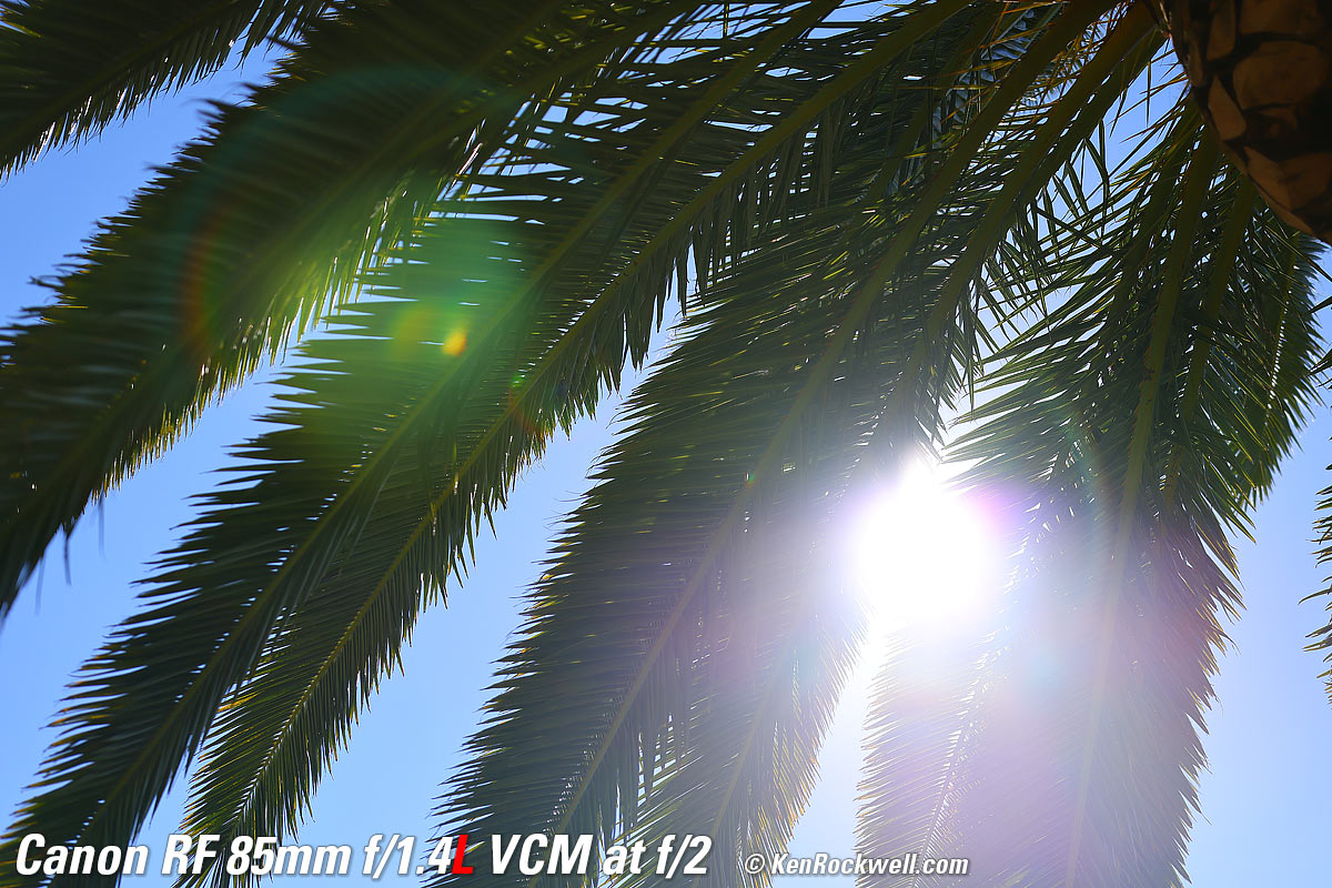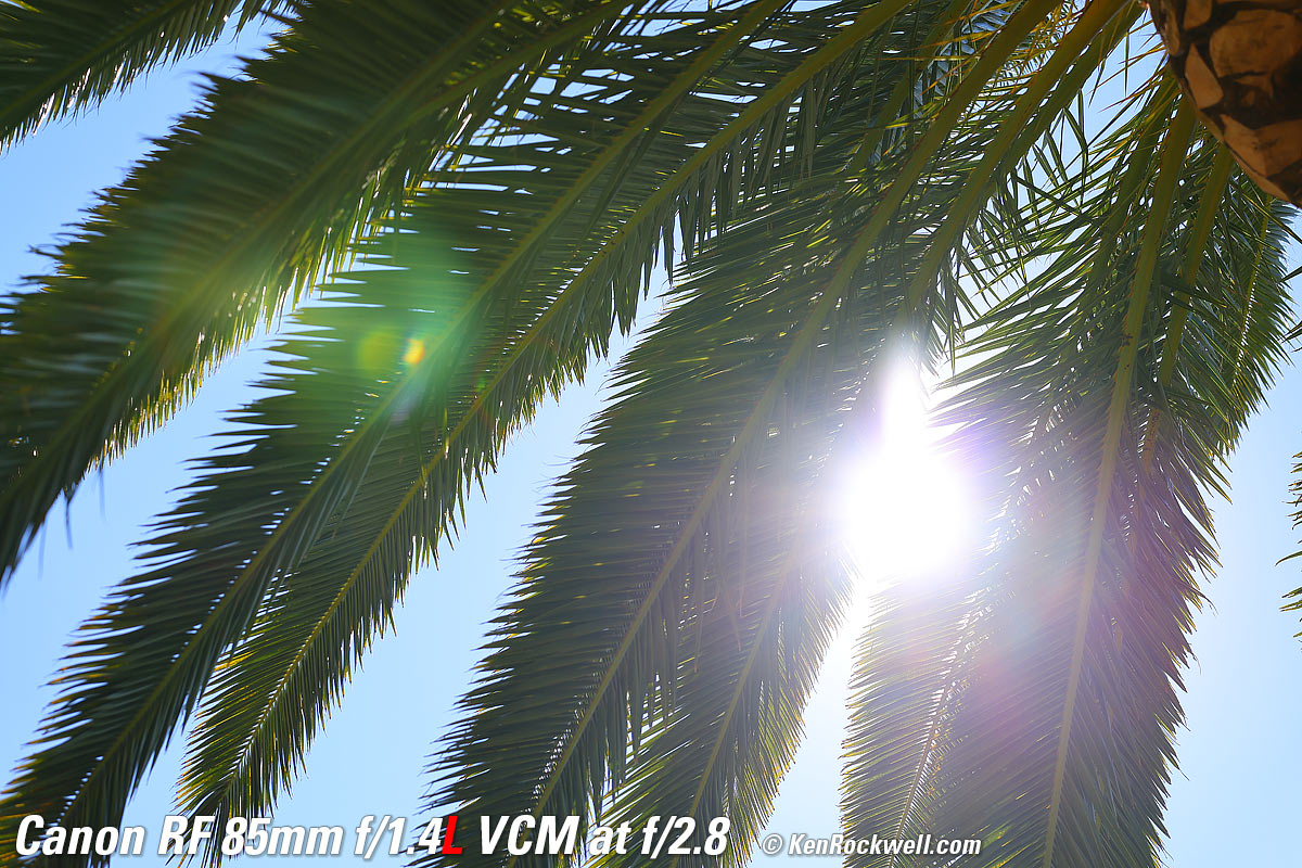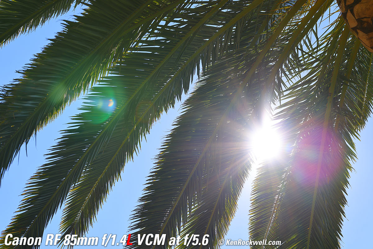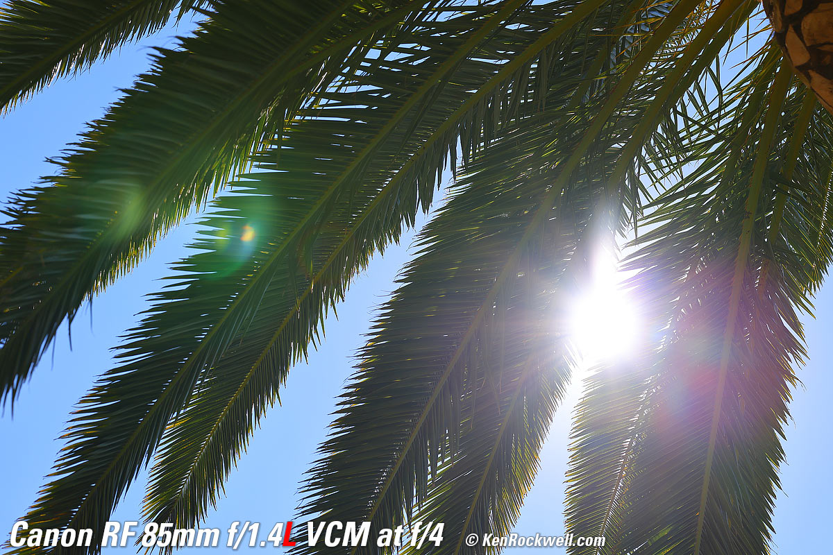 Sunstars performance topWith an 11-bladed rounded diaphragm, I get mild 22-point sunstars on brilliant points of light only at the smallest apertures. Ignore the vertical smears at large apertures. This is a sensor artifact called interline transfer smear and is a camera, not a lens, defect. Likewise ignore the crazy rainbow dots at small apertures; these are sensor artifacts caused by interference among the divisions between pixels on the sensor. These are made visible because we're using enough exposure to show the dark underside of a huge palm tree, and then putting the blinding disk of the mid-day sun in it. Doing this will show everything due to the insane lighting range. Click any to enlarge: Click any to enlarge.