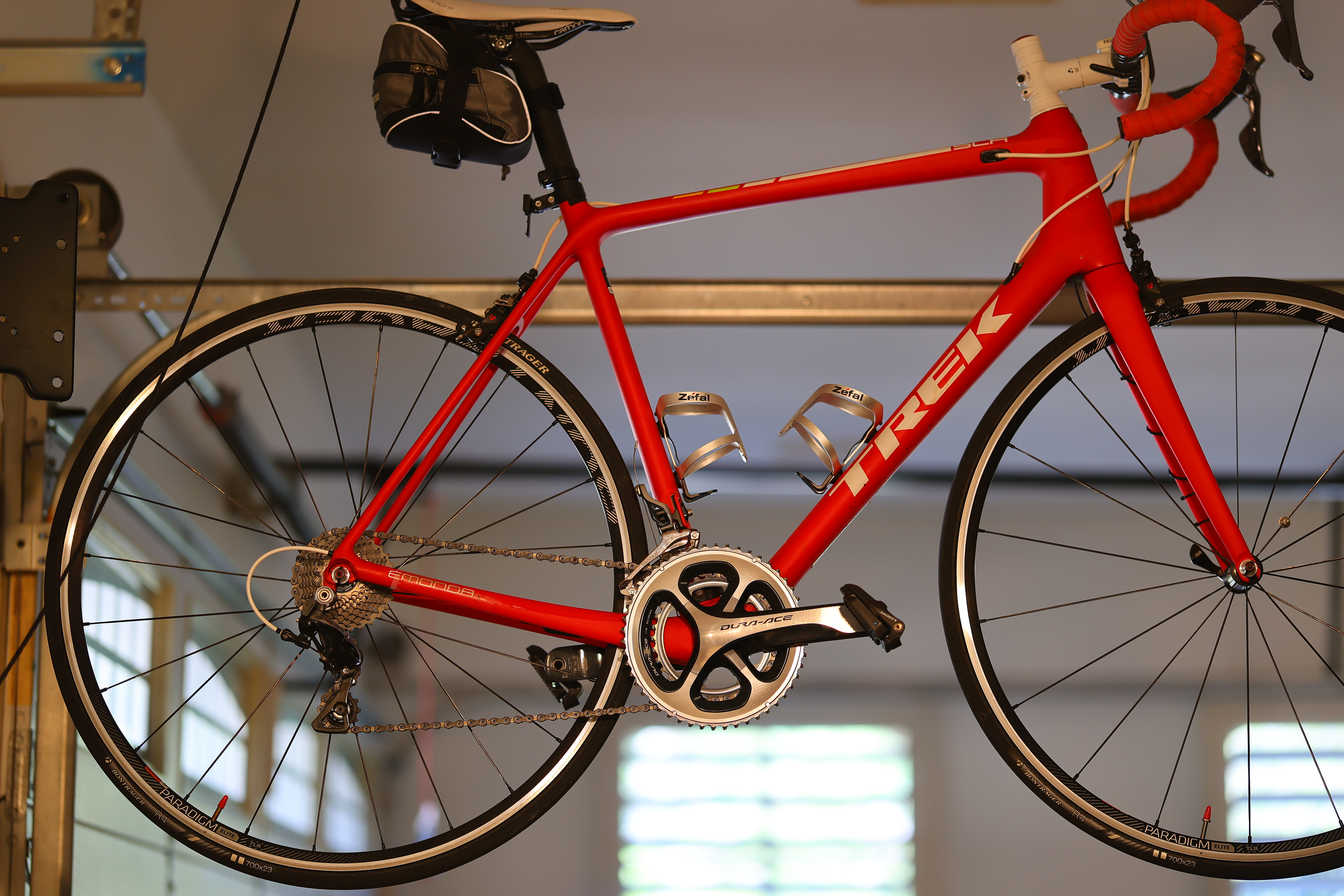 American-made Trek Émonda SLR 8 Hanging Down from the Ceiling, 4:45 PM, Friday the 13th of February 2026. Canon EOS R6 III, Canon RF 85mm f/1.4L VCM wide-open at f/1.4 at 1/160 at Auto ISO 100, +0.3 stops exposure compensation (LV 8.4), Radiant Photo software to add light on the bicycle. bigger, full resolution or camera-original 32 MP © 7.6 MB image. As you can see, so long as it's actually in focus, even at f/1.4 its as sharp as it is stopped down. This is superb performance. What seems like green fringes on the window highlights is not spherochromatism; it's loads of green vegetation outside.
