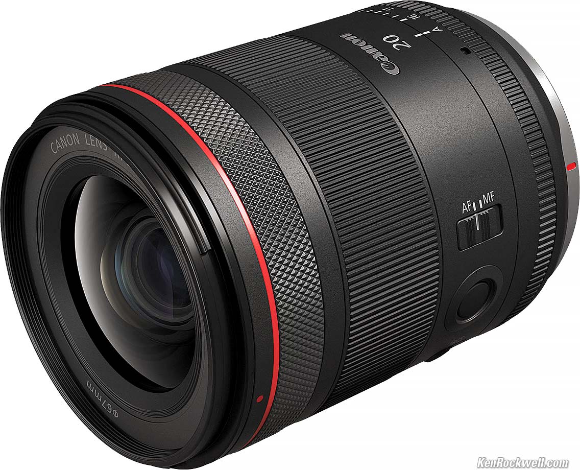 RF 20mm f/1.4L VCMCanon RF 20mm f/1.4L VCM. bigger. New as of 2025, this is the fastest lens here, with at least two stops (four times) the light gathering power of any of the other lenses. This lens is for astronomers and people who work in extremely low light, or people who need to stop action in regular low light. It is not for getting soft backgrounds; focal length is far more important for that than f/stop; even the inexpensive RF 50mm f/1.8 STM will give much softer backgrounds than this lens. This f/1.4 lens is all about gathering lots of light so we can shoot at lower ISOs for cleaner images or with shorter exposure times so we can spend less time freezing out in the dark shooting the Milky Way, or use shorter exposure times for action which image stabilization cannot stop. This lens has no image stabilization