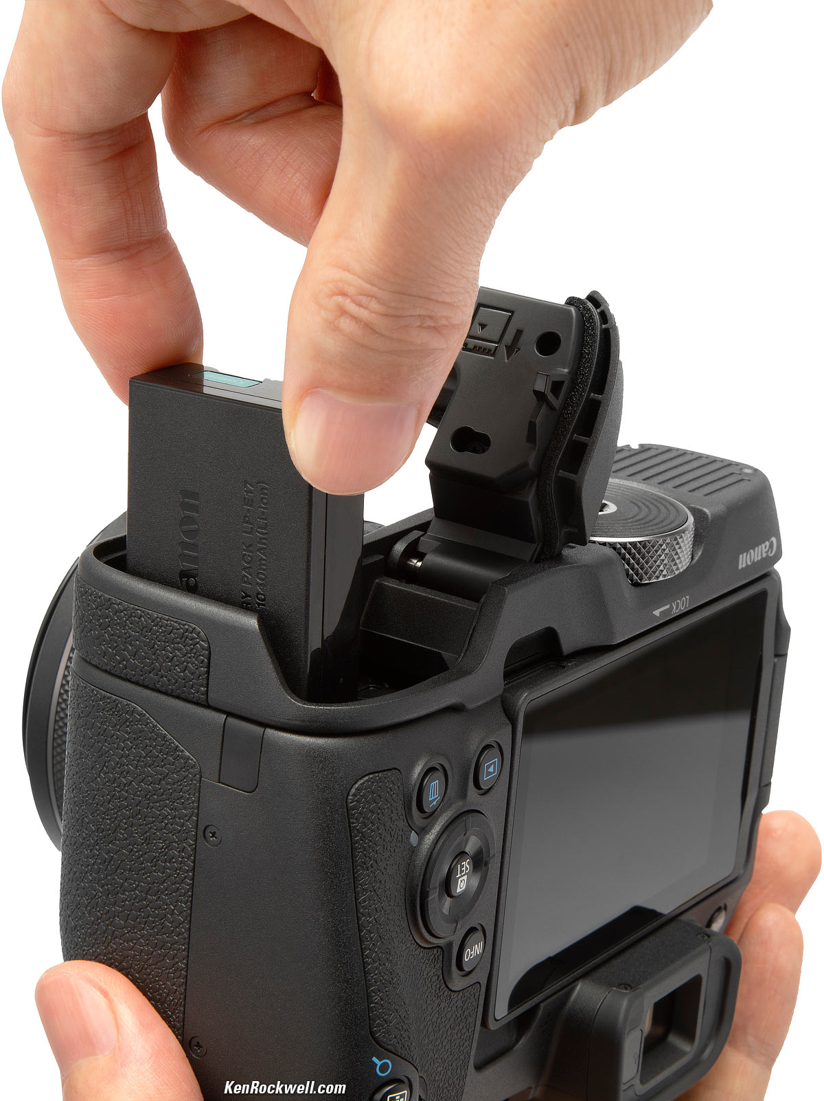 Power & BatteryBatteryLP-E17 rechargeable Li-Ion battery included. The LP-E17 is rated for 210 shots with the EVF, or 250 with the LCD, CIPA. Use ECO and low frame-rate EVF modes as I do and it's rated for 250 shots with the EVF, or 270 with the LCD. At freezing (0ºC/32ºF) it's rated for 200 to 250 shots. 7.2V, 1,040 mAh. 1.30 x 0.55 x 1.94." 33 x 14 x 49.4mm. 1.59 oz./45g.