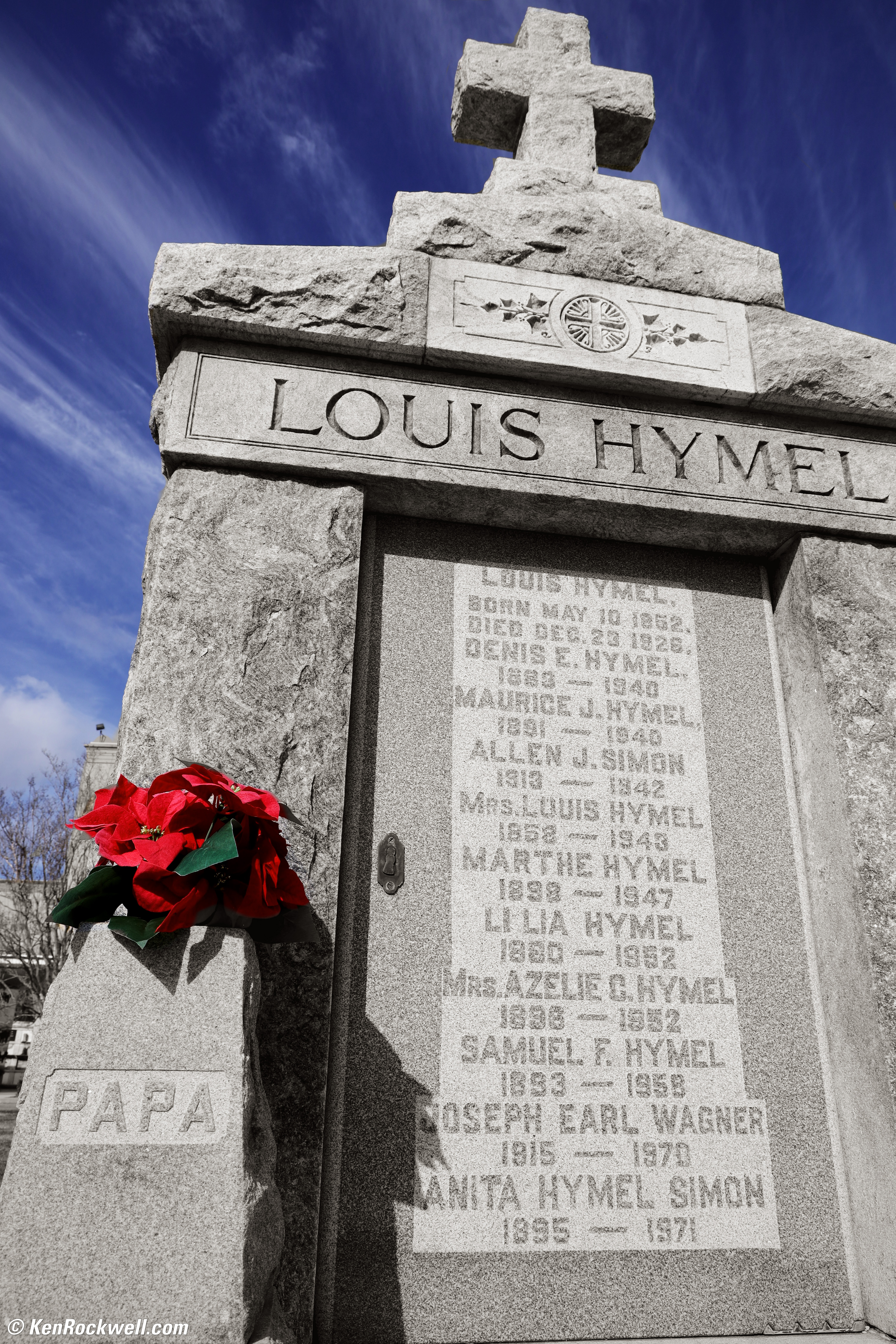 Final Resting Place of Louis Hymel, New Orleans, Louisiana, February, 2019. Canon EOS RP, Canon RF 24-105mm f/4L IS at 24mm, 1/400 at f/10 at Auto ISO 100, Perfectly Clear. bigger, full-resolution or camera-original © file.