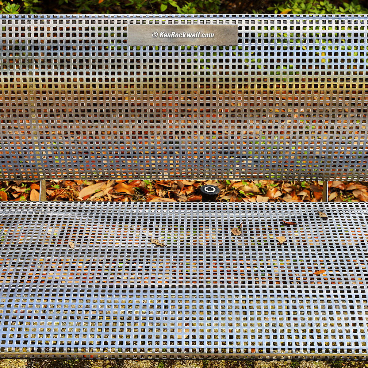 Perforated Metal Bench, New Orleans, Louisiana, February, 2019. Canon EOS RP, Canon RF 24-105mm f/4L IS at 58mm, 1/25 hand-held at f/10 at Auto ISO 100, Perfectly Clear. bigger.